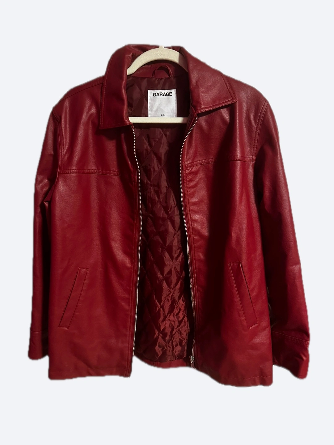Here's a stylish red faux leather jacket from Garage in size P/S! It's in great condition and ready for a new home. Perfect for adding a pop of colour to your wardrobe!