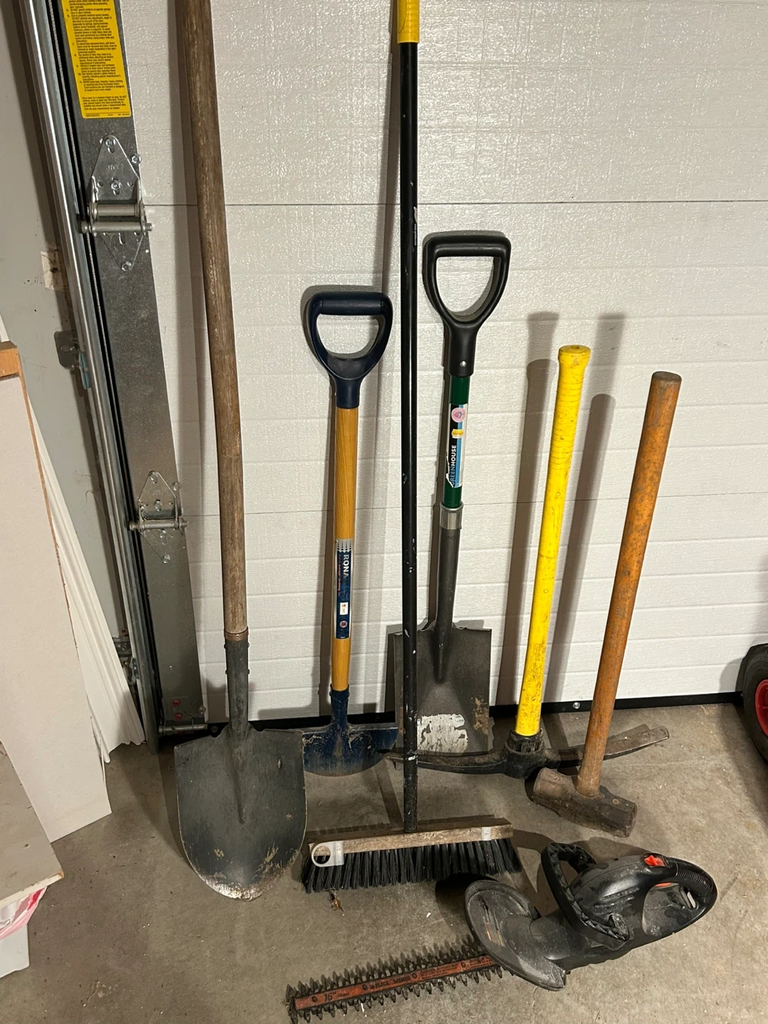 A collection of garden tools including shovels, a broom, and an electric hedge trimmer. Perfect for getting your yard in shape!