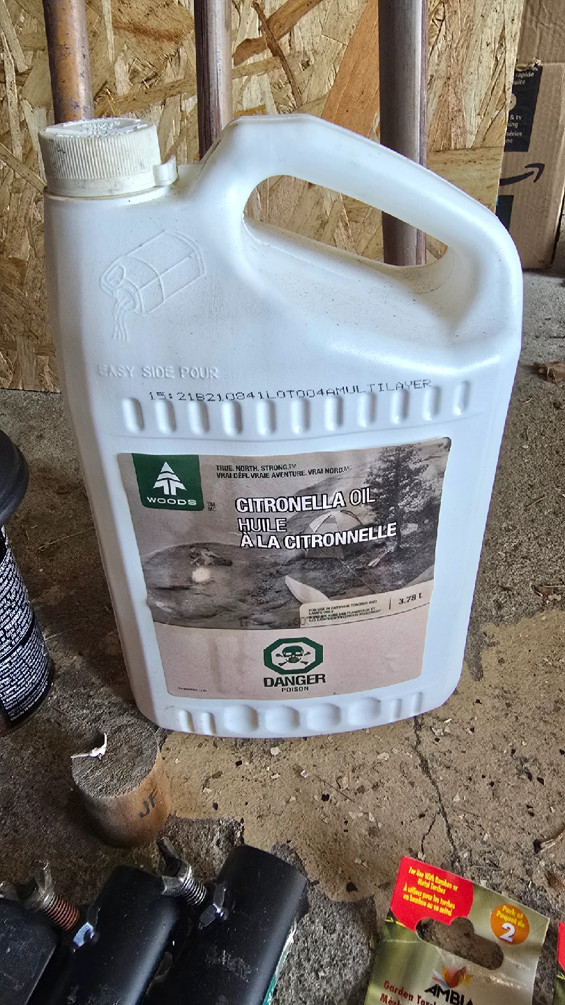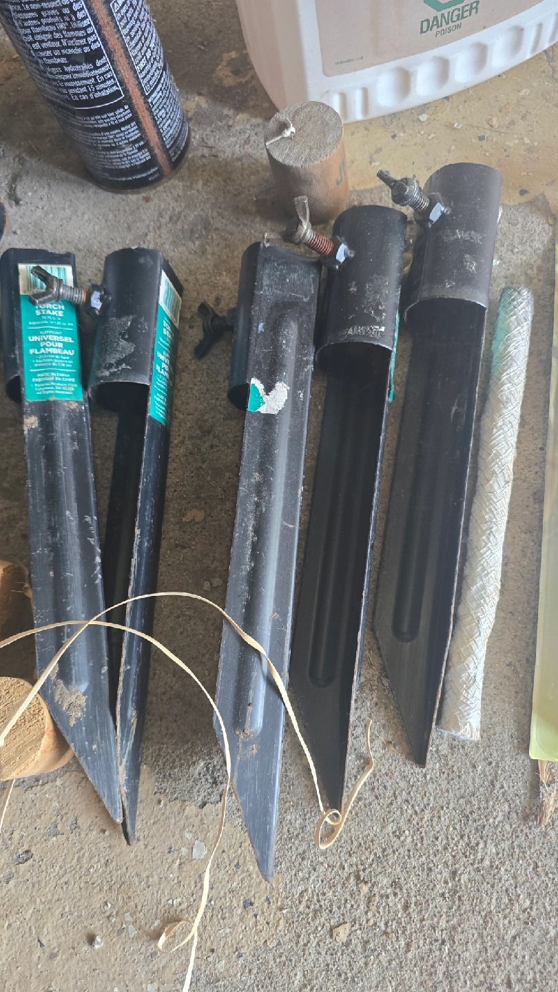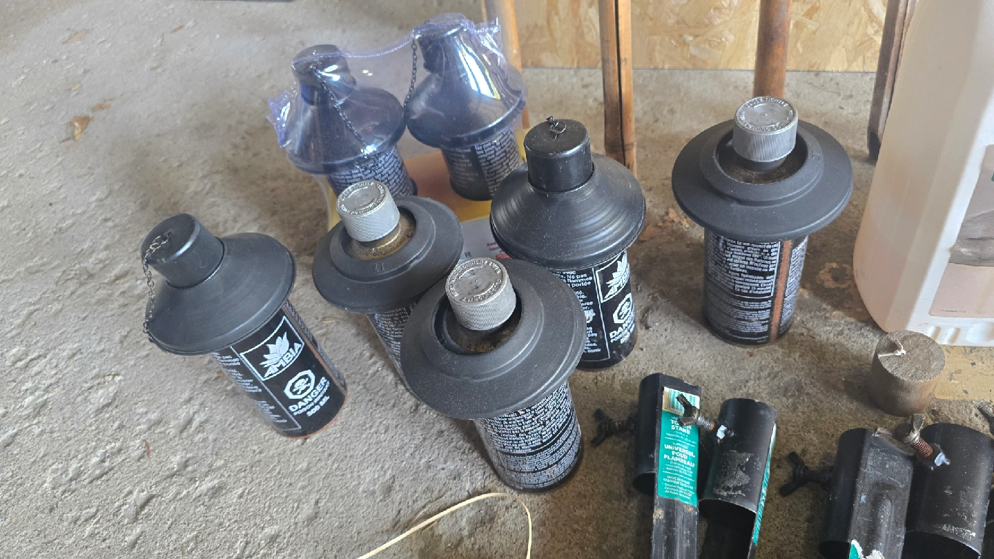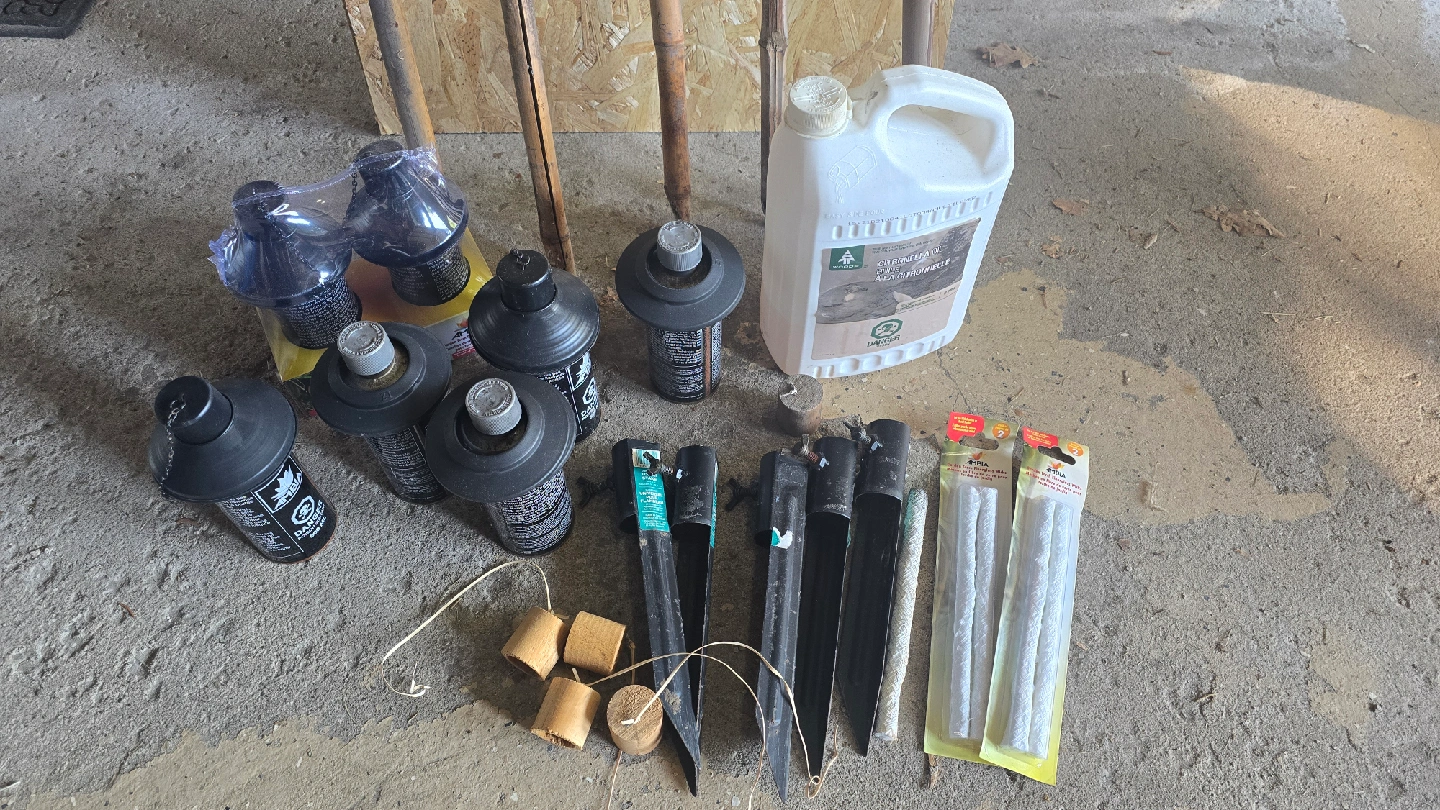 Everything you need for your garden torches! Includes: - 5 Bamboo Torches - Woods Citronella Oil (3.78 L) half full - Garden Torch Fiberglass Wicks (pack of 2) - Universal Torch Stakes