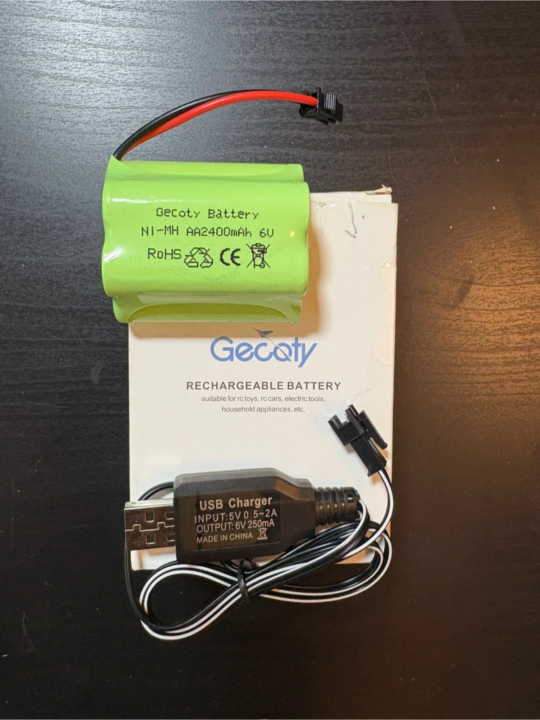 Selling a Gecoty rechargeable battery suitable for RC toys, RC cars, electric tools, and household appliances. It's a Ni-MH AA2400mAh 6V battery. Included is a USB charger with INPUT: 5V 0.5~2A and OUTPUT: 6V 250mA.