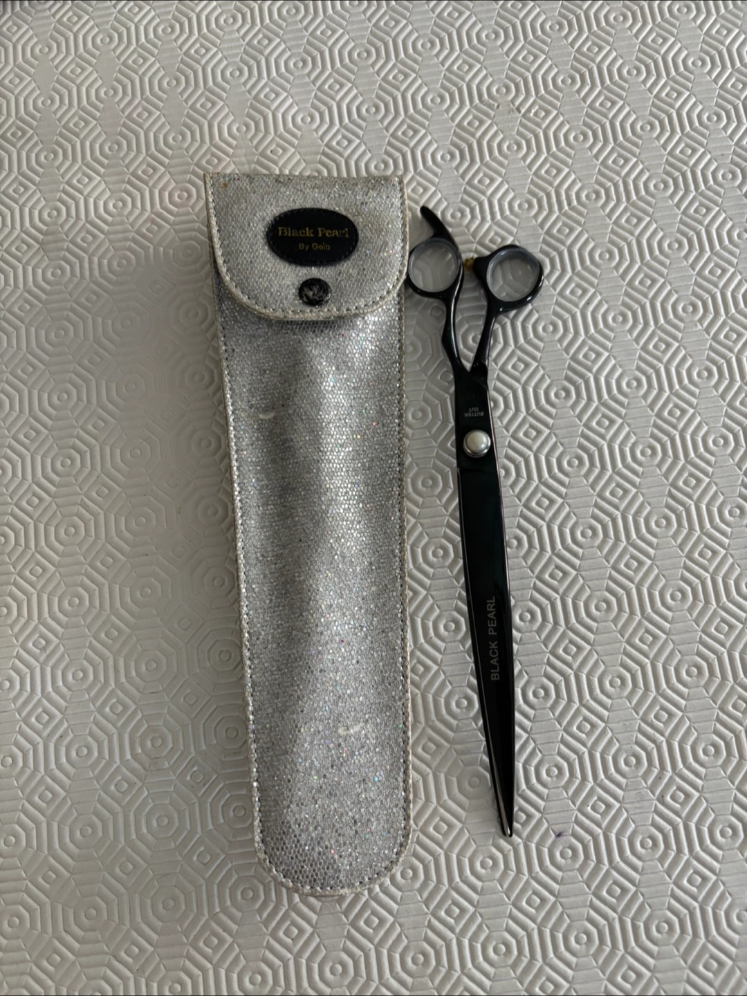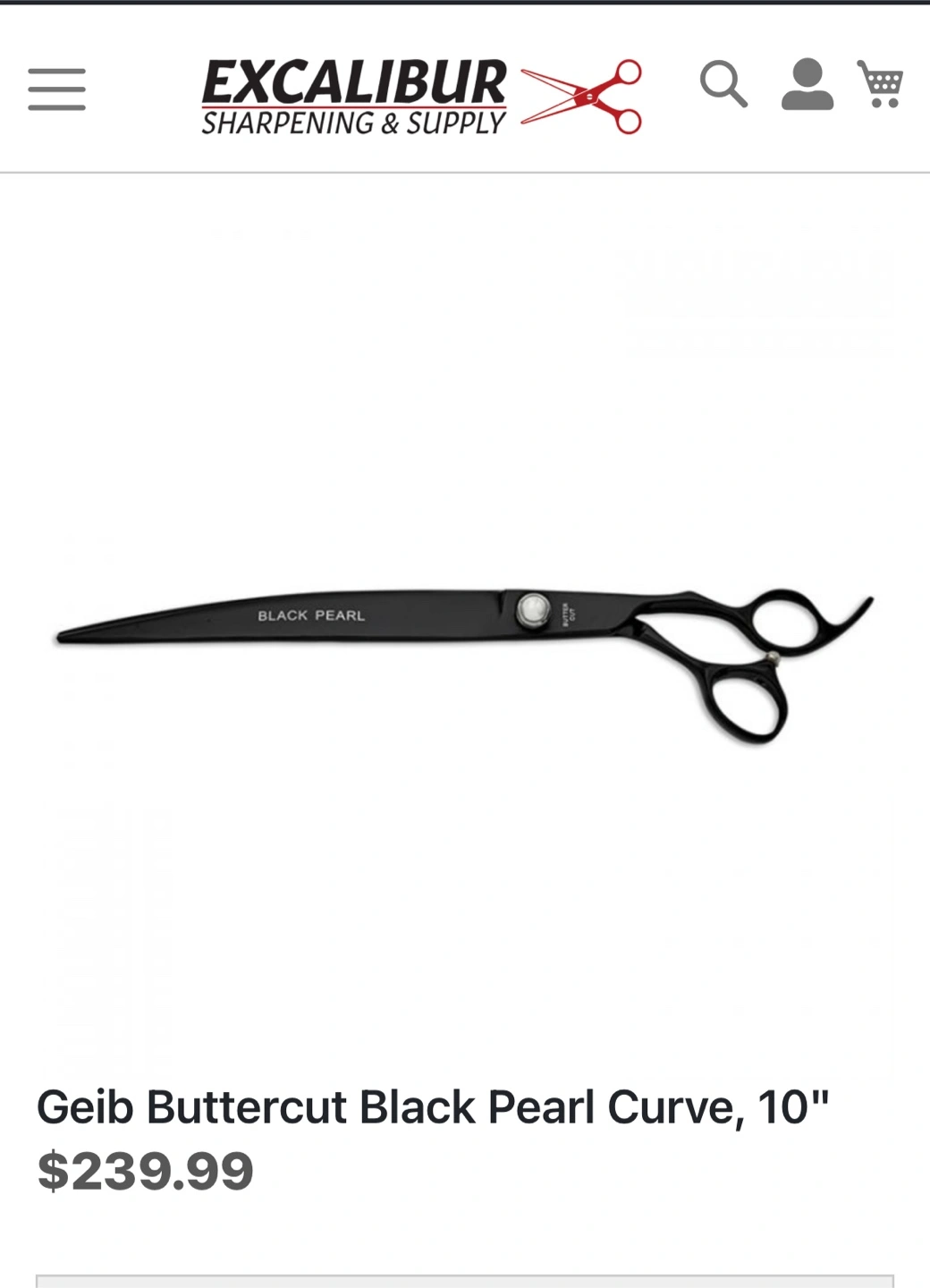 A pair of professional grooming sheers Geib Buttercut Black Pearl curved Cobalt Alloy Japan BP10 are in great condition, it’s perfect for scissoring on big dogs and it’s 10” inches in length. Original price $239.99