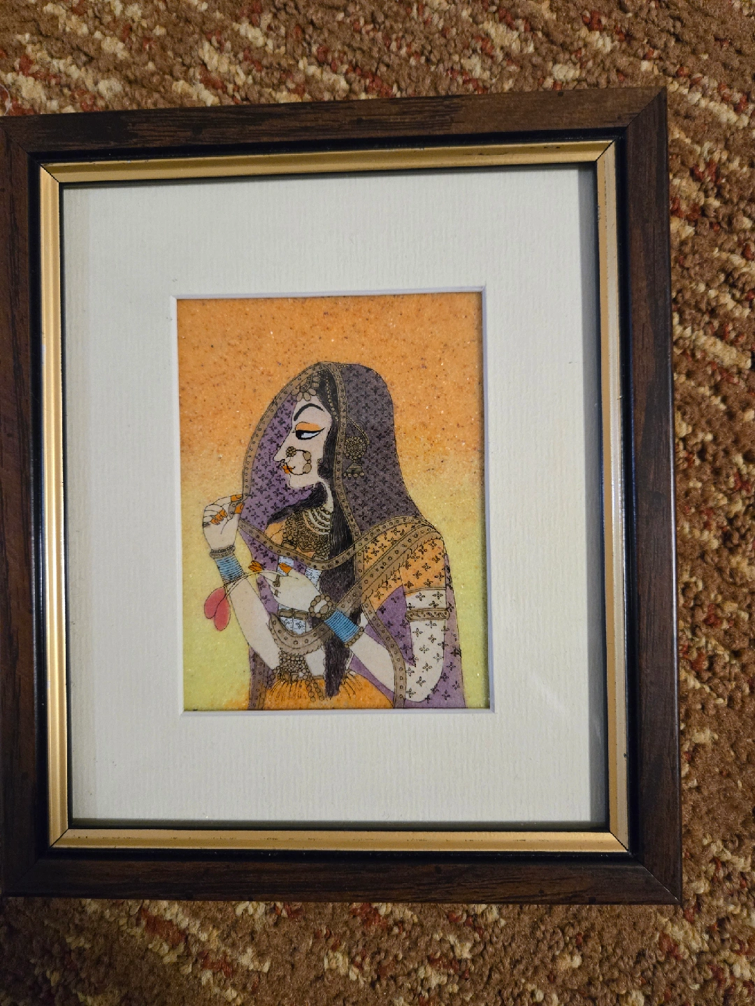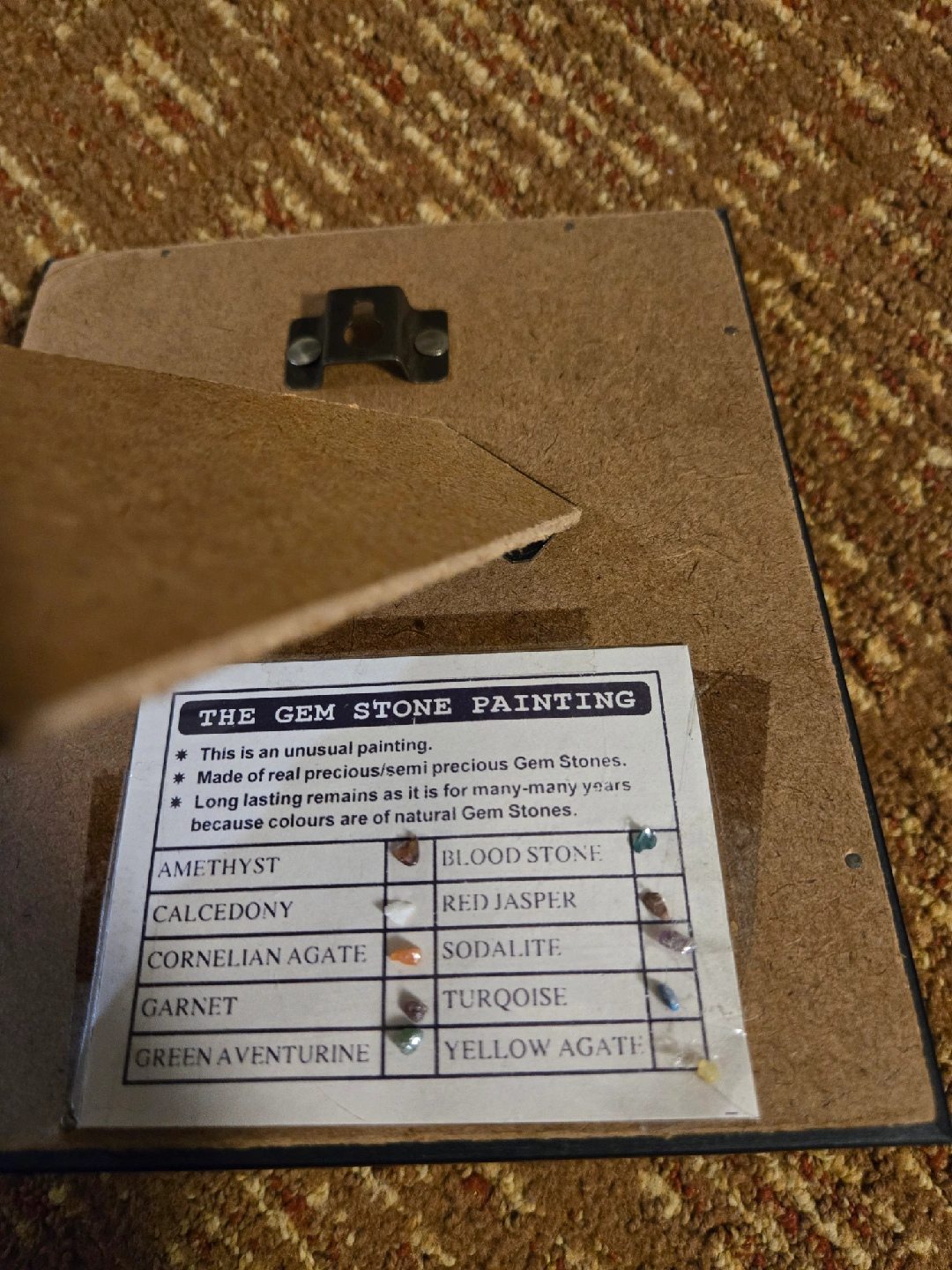 This is an unusual painting made of real precious/semi precious Gem Stones. Long lasting remains as it is for many-many years because colours are of natural Gem Stones. The Gem Stone Painting includes Amethyst, Blood Stone, Calcedony, Red Jasper, Cornelian Agate, Turquoise, Garnet, Green Aventurine, and Yellow Agate