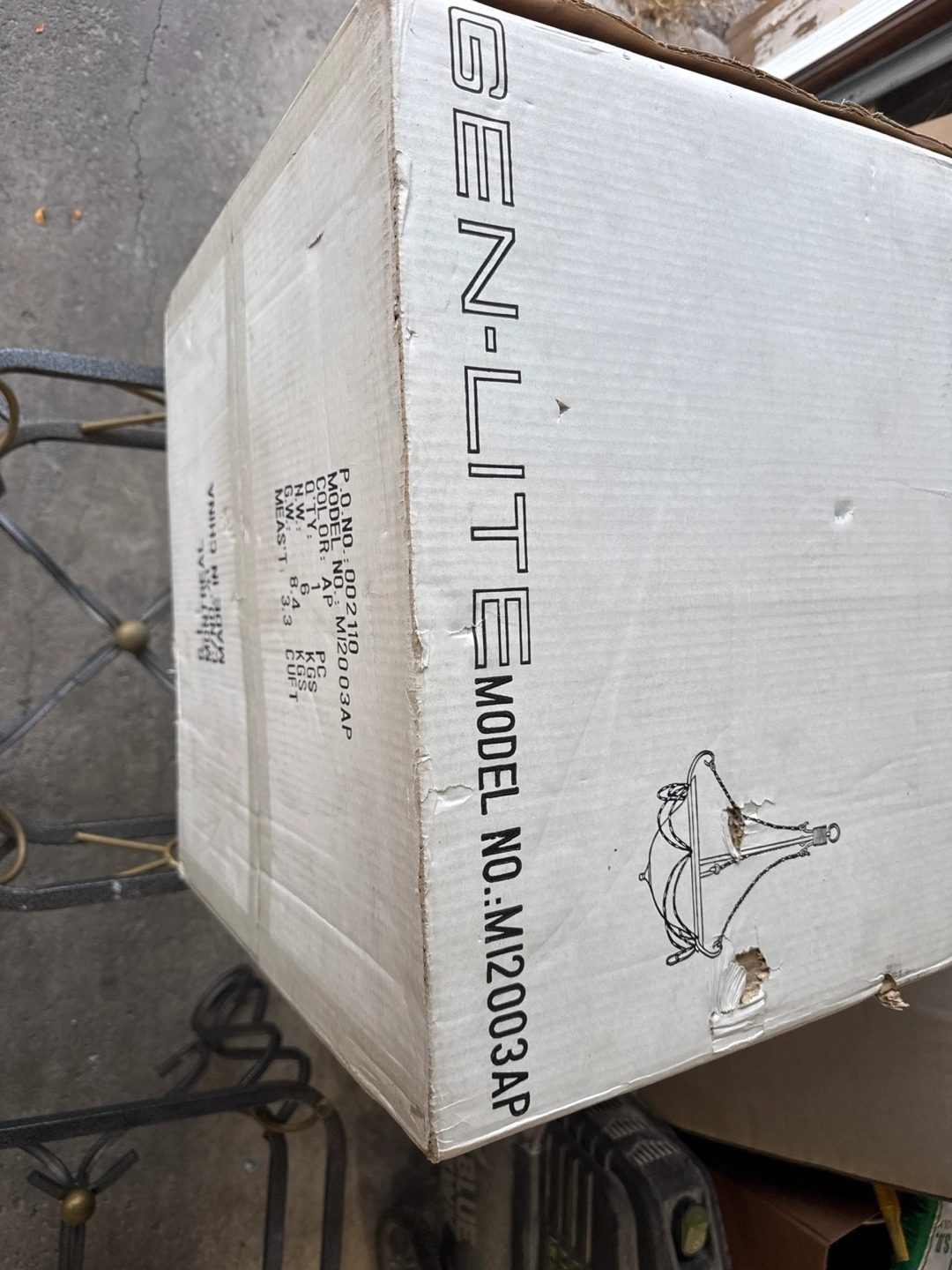 Selling a Gen-Lite lighting fixture, model number M12003AP. The colour is AP. It weighs 6 KGS and the measurements are 3.3 CUFT. Box included!
