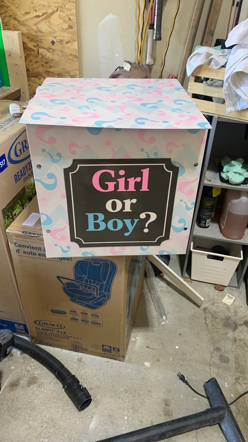 Selling a 'Girl or Boy?' gender reveal box. It's in great condition and ready to make your special announcement even more memorable! The box has a cute design with pink and blue question marks