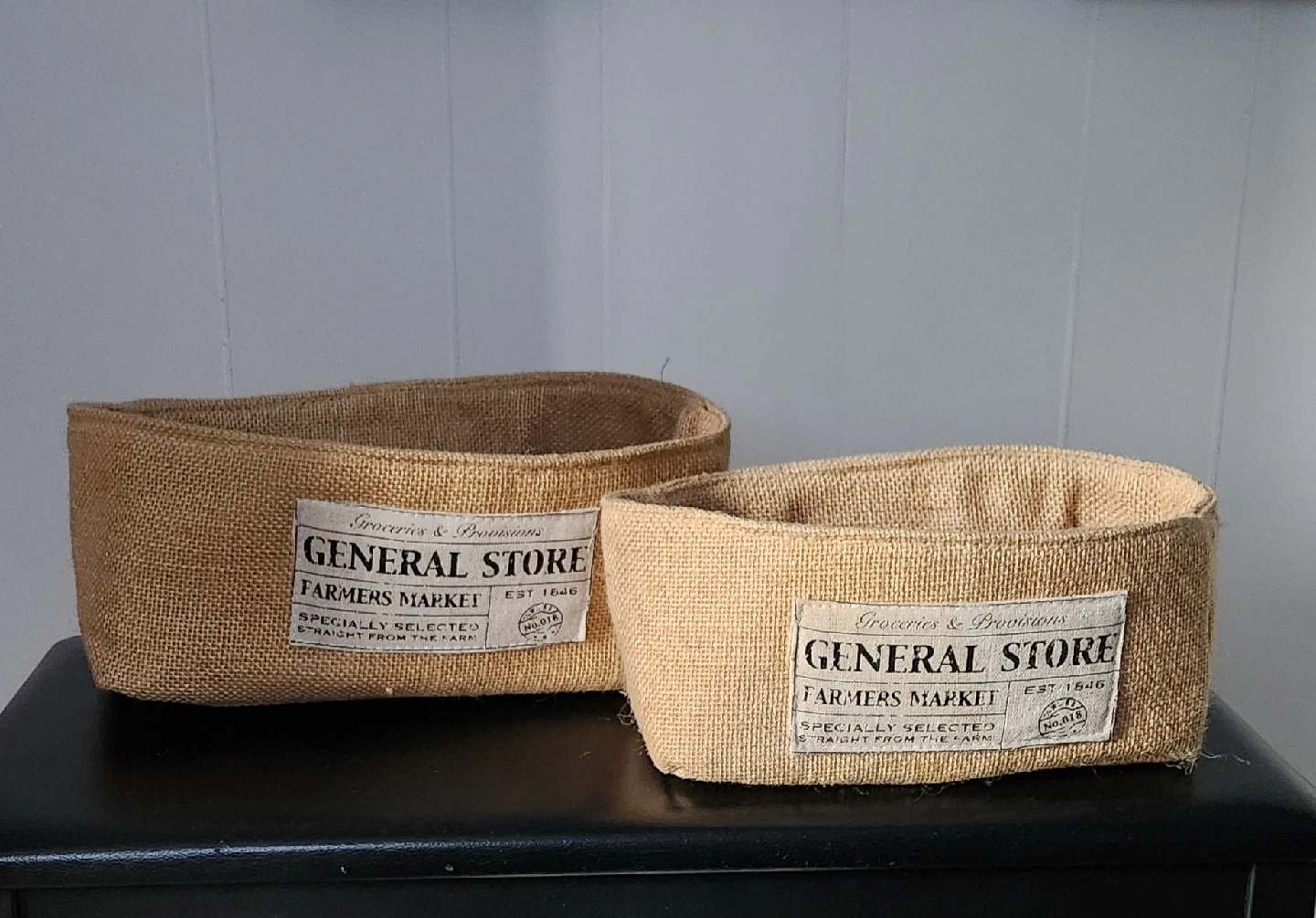 Two cute General Store Farmers Market baskets! They're perfect for adding a touch of rustic charm to your home. Small Basket: 9.5" x 5" x 4.5" Large Basket: 10.5" x 5" x 5.5"
