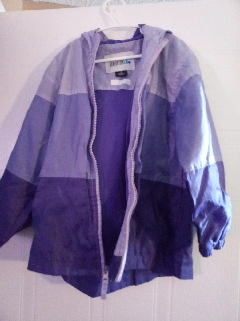 A cute purple rain jacket for kids! It's a size 6 from Generations and features a stylish colour-blocked design. Perfect for keeping your little one dry on those rainy days!