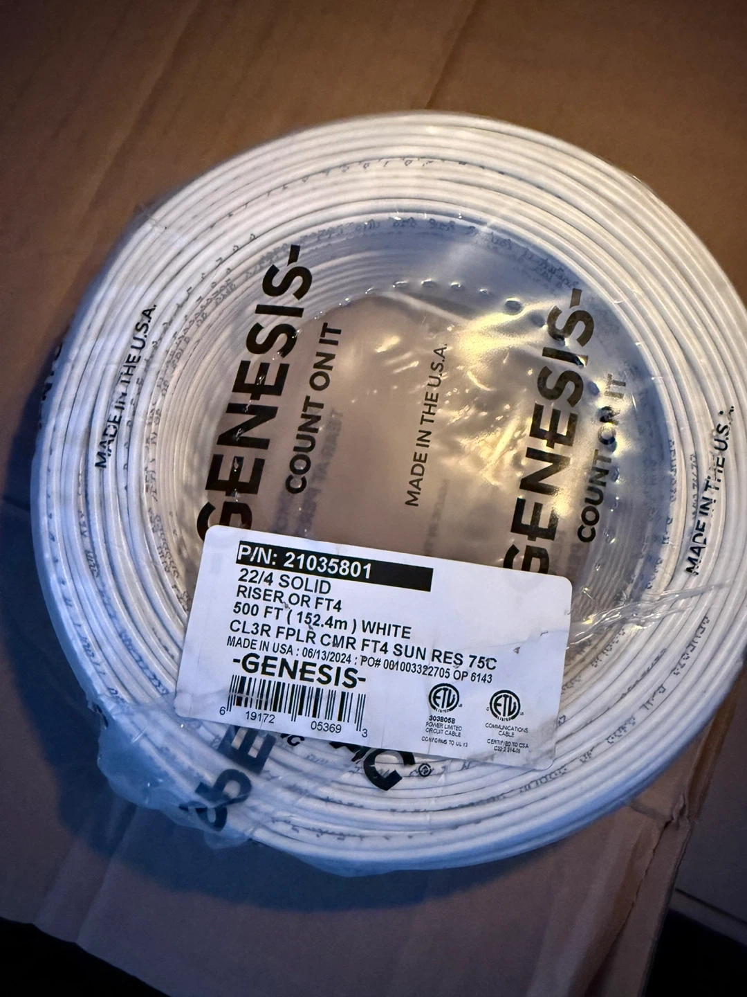 Selling a roll of Genesis 22/4 Solid Riser or FT4 cable. It's a 500 ft (152.4m) white cable, CL3R FPLR CMR FT4 SUN RES 75C. Made in the USA.
