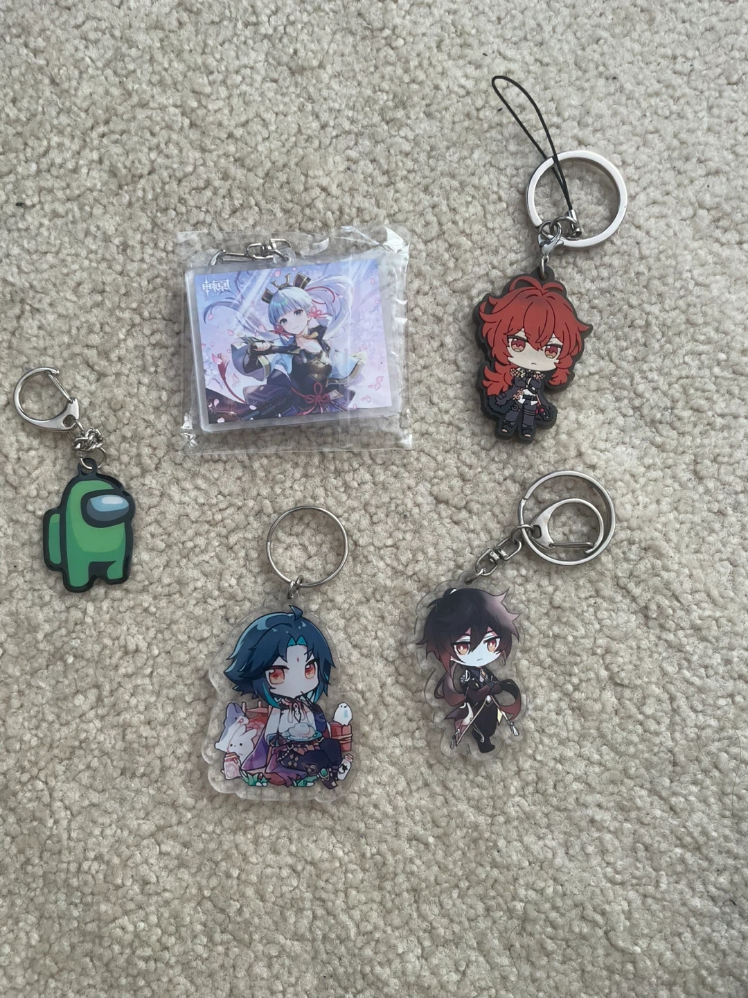 Selling a collection of adorable keychains! There's a sealed Ayaka keychain, a Diluc keychain, a Xiao keychain, a Zhongli keychain, and an Among Us keychain. Perfect for adding some flair to your keys or backpack!