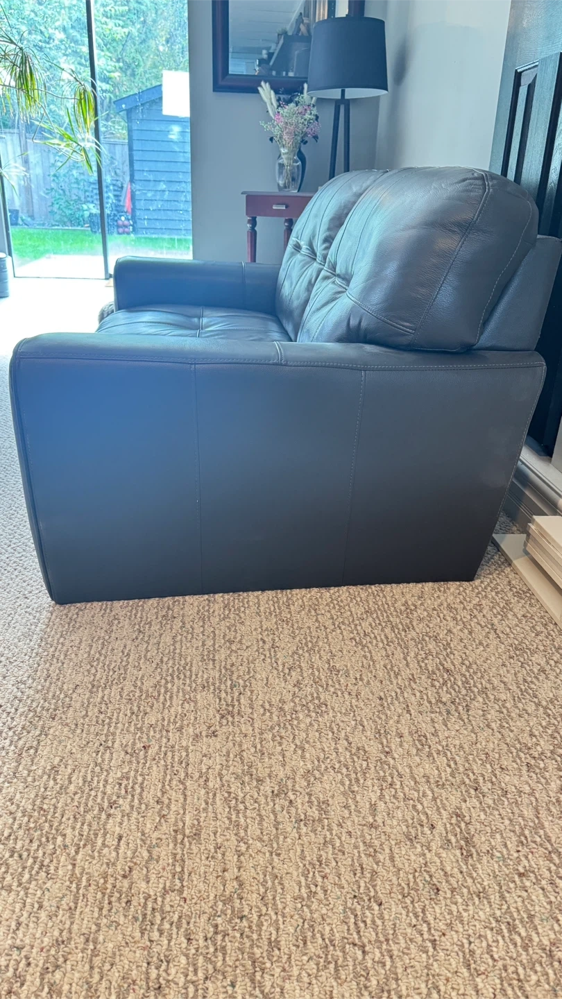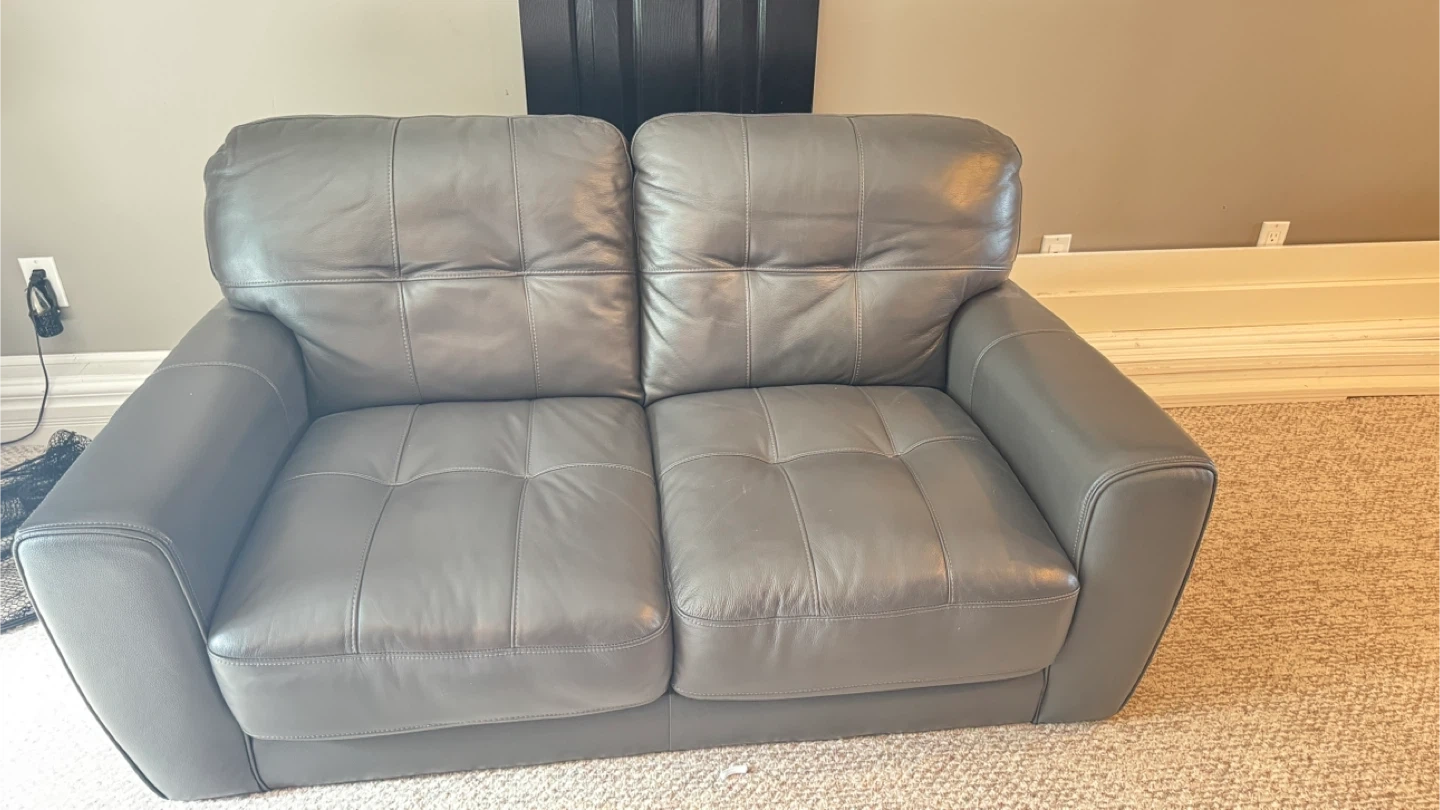 Grey genuine leather loveseat in excellent condition — looks and feels brand new! Comes from a smoke-free home, with no stains, tears, or scratches. Details: -Dimensions: 57” (W) x 35” (D) x 33” (H) -Colour: Charcoal Grey -Material: 100% genuine leather -Includes legs (not shown in the photo) Very comfortable and well cared for. Perfect for a living room, office, or small space. Pickup only**