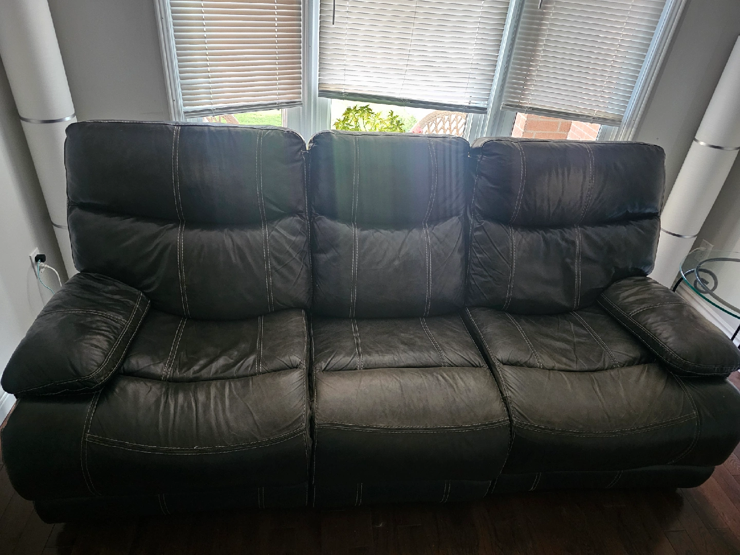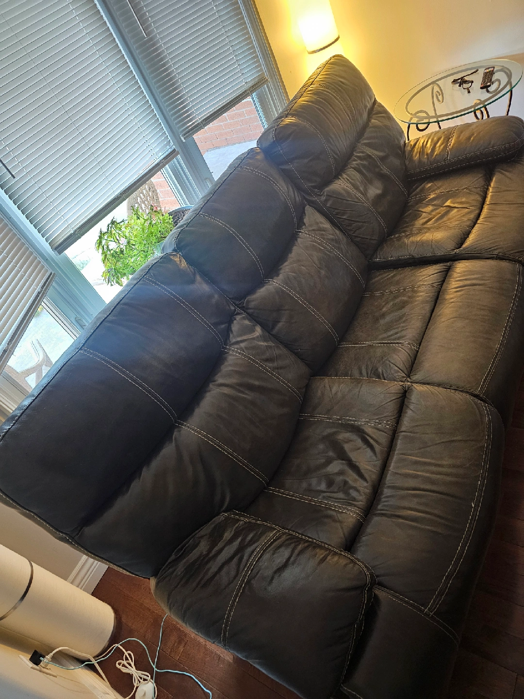 Selling a comfy dark brown leather reclining sofa! It's a great addition to any living room for relaxing and watching movies. The sofa has some signs of wear, but it's still in good condition and very functional. Perfect for anyone looking for a comfortable seating option!