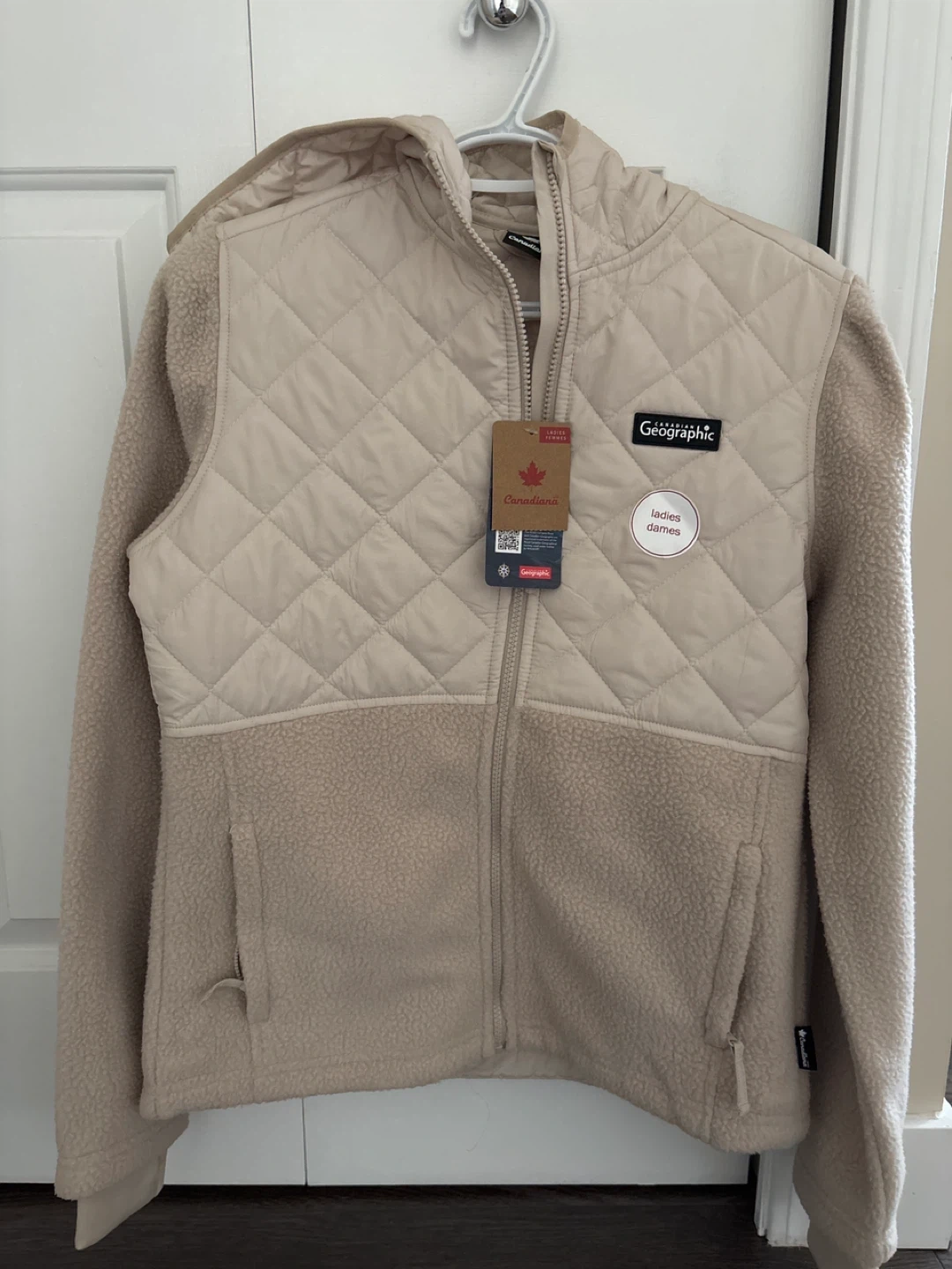 Selling a Geographic ladies fleece jacket. It's in great condition and ready for a new home! The jacket features a quilted design on the upper part and cozy fleece on the lower part and sleeves. Perfect for staying warm and stylish!
