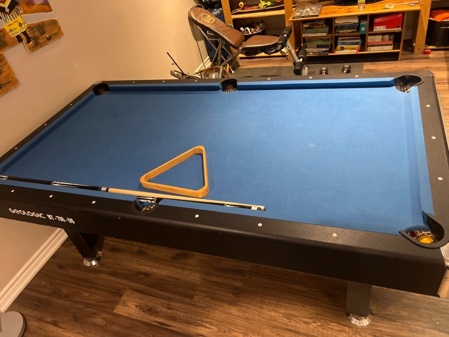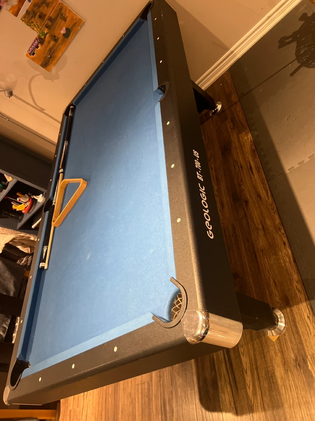 Selling a Geologic BT-700 US pool table. It's in great shape and ready for a new home! Comes with a triangle and pool cue. Only cash and you have to pick it up at the place