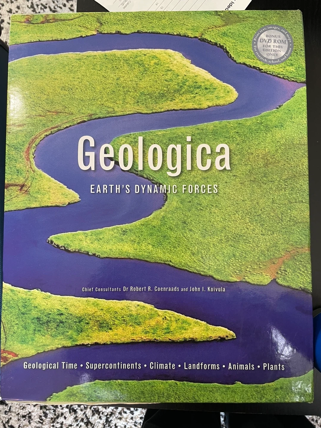 "Geologica: Earth's Dynamic Forces". This edition includes a bonus DVD ROM with print text, images, and maps for research, school, and home. It covers topics such as geological time, supercontinents, climate, landforms, animals, and plants. XL book 16”x13”