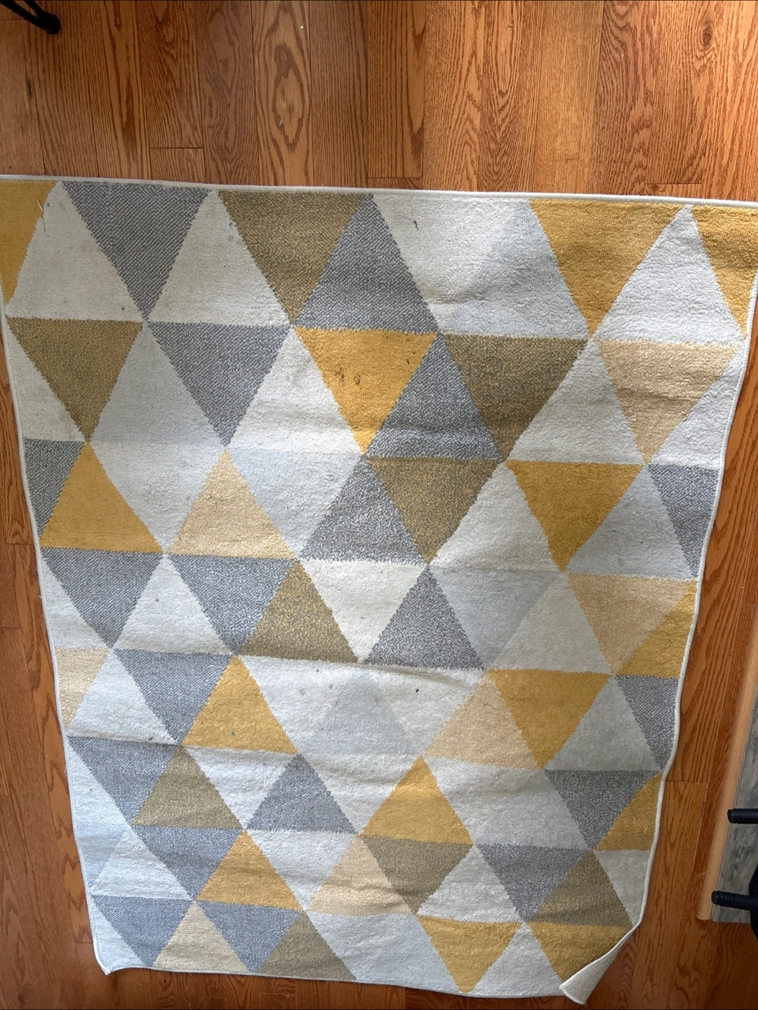 Here's a rug with a cool geometric pattern, featuring triangles in yellow, grey, and white! It's perfect for adding a bit of style to any room. It does show some signs of use, but still has lots of life left in it