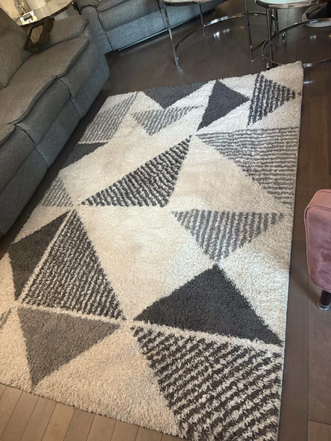Selling a shag rug with a geometric pattern. It features shades of grey and white. This rug would be a cozy addition to any living space!