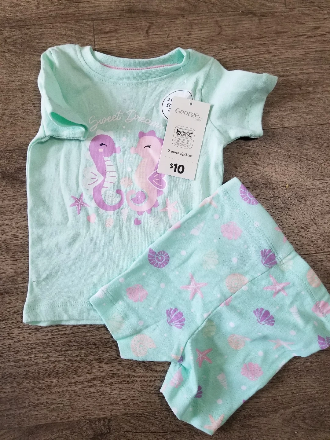 This adorable George Baby outfit is perfect for your little one! It's a 2-piece set featuring a cute sea theme with seahorses, shells, and starfish. The shirt has a 'Sweet Dreams' print. Size 3-6 months