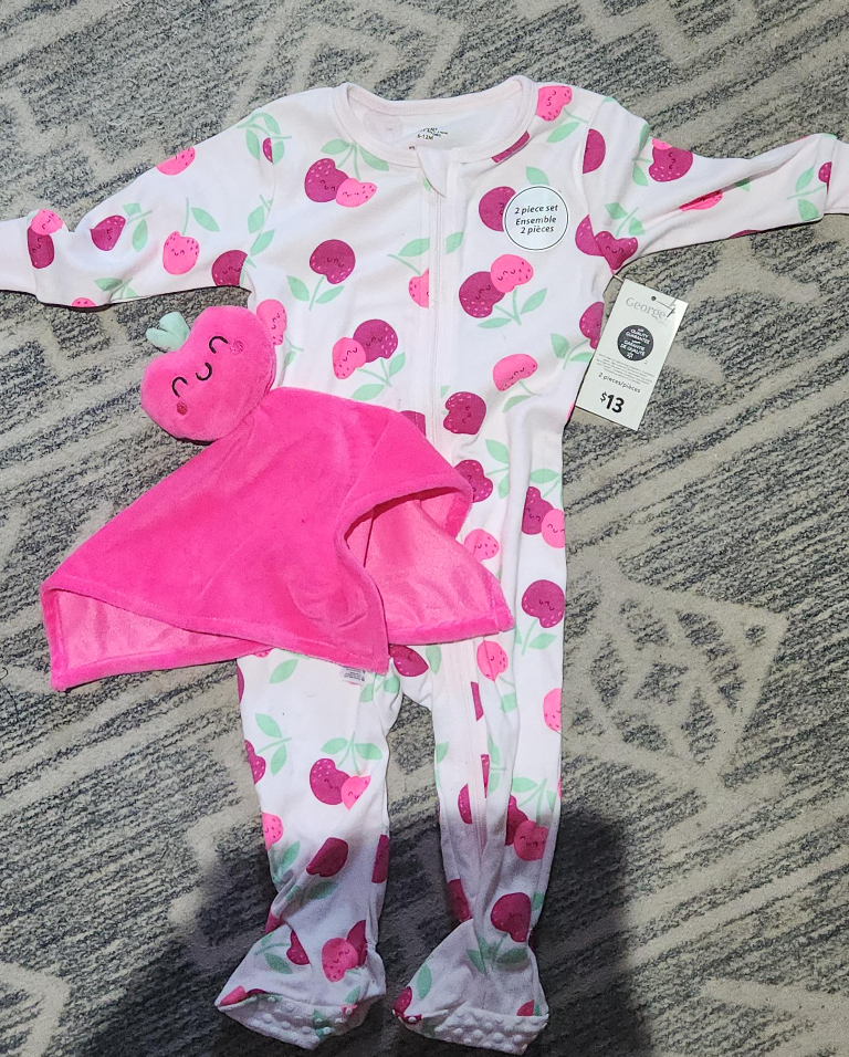 Super cute George baby pyjamas and blanket set! The PJs are a size 6-12 months and feature a sweet cherry pattern. A matching pink blanket is also included. Originally bought for $13