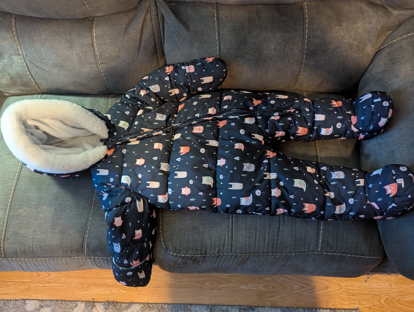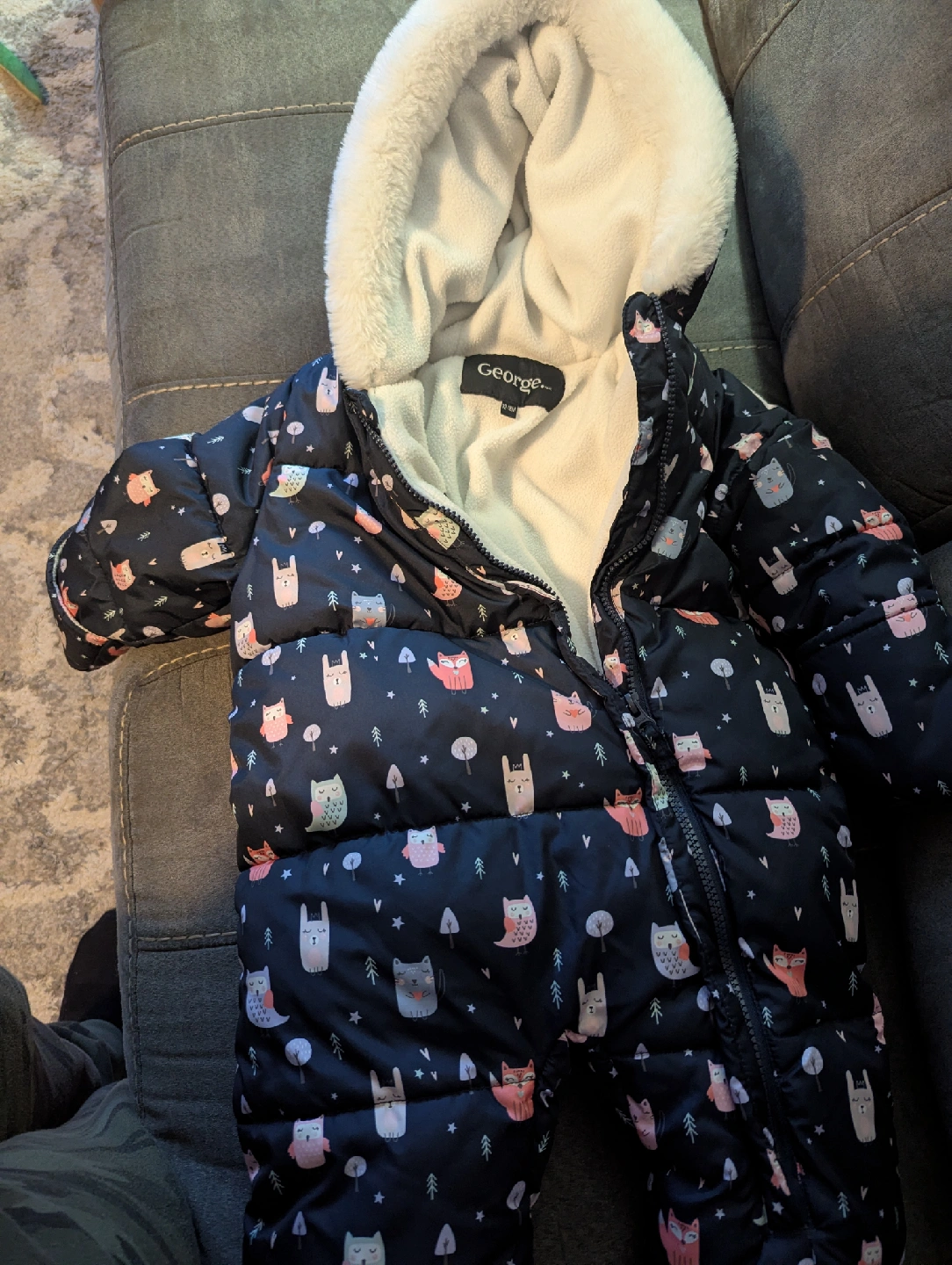 Keep your little one warm this winter with this adorable George baby snowsuit! It features a cute pattern and a cozy hood. Size is 12-18 months.