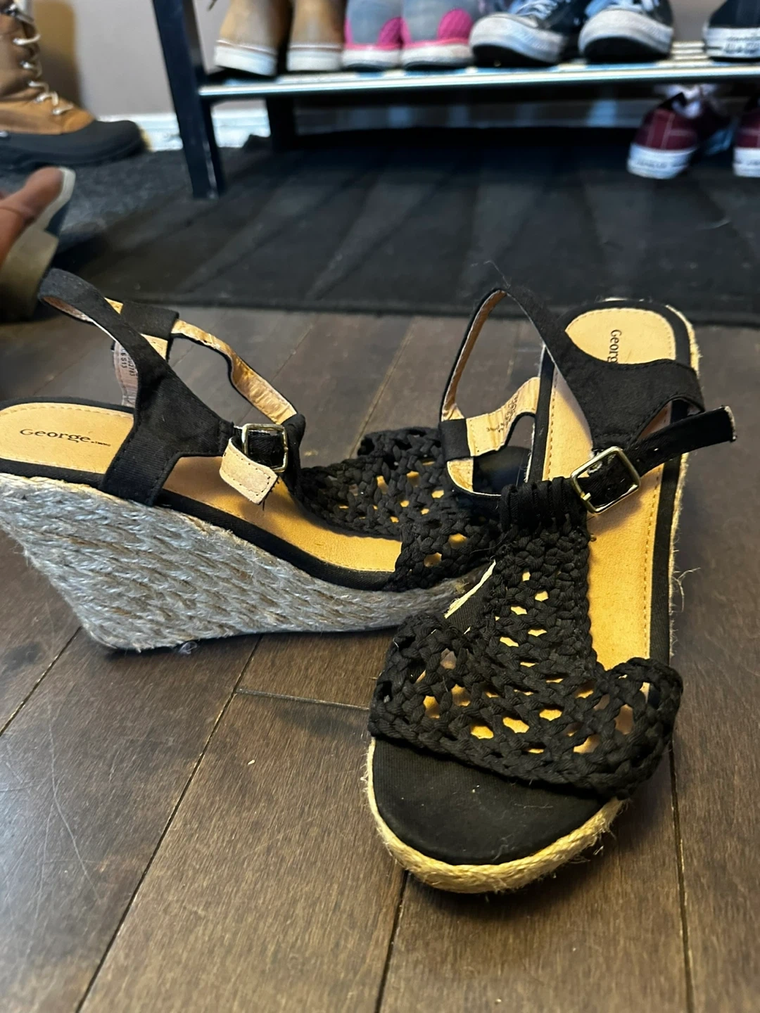 Cute black wedge sandals from George! They feature a woven design on the front and a comfortable wedge heel. Perfect for adding a little height and style to your summer outfits To big for me size 8