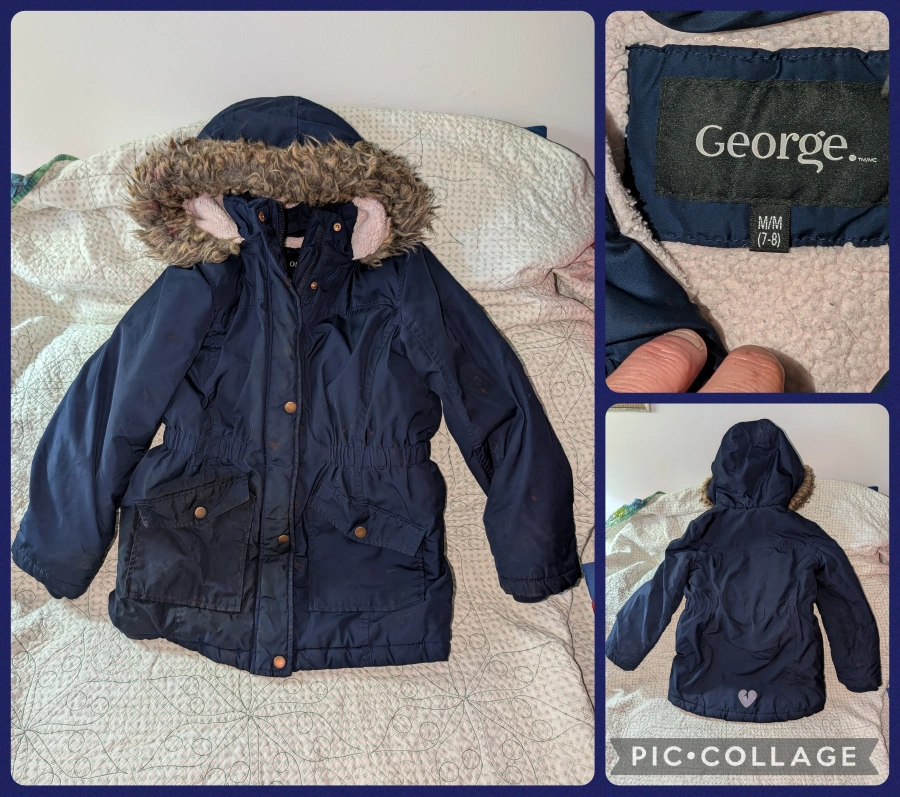 Selling a George brand winter parka in size M (7-8). It's a navy blue colour with a faux fur trim on the hood. The inside is lined with a cozy, soft material. It has a few marks, but still lots of life left!