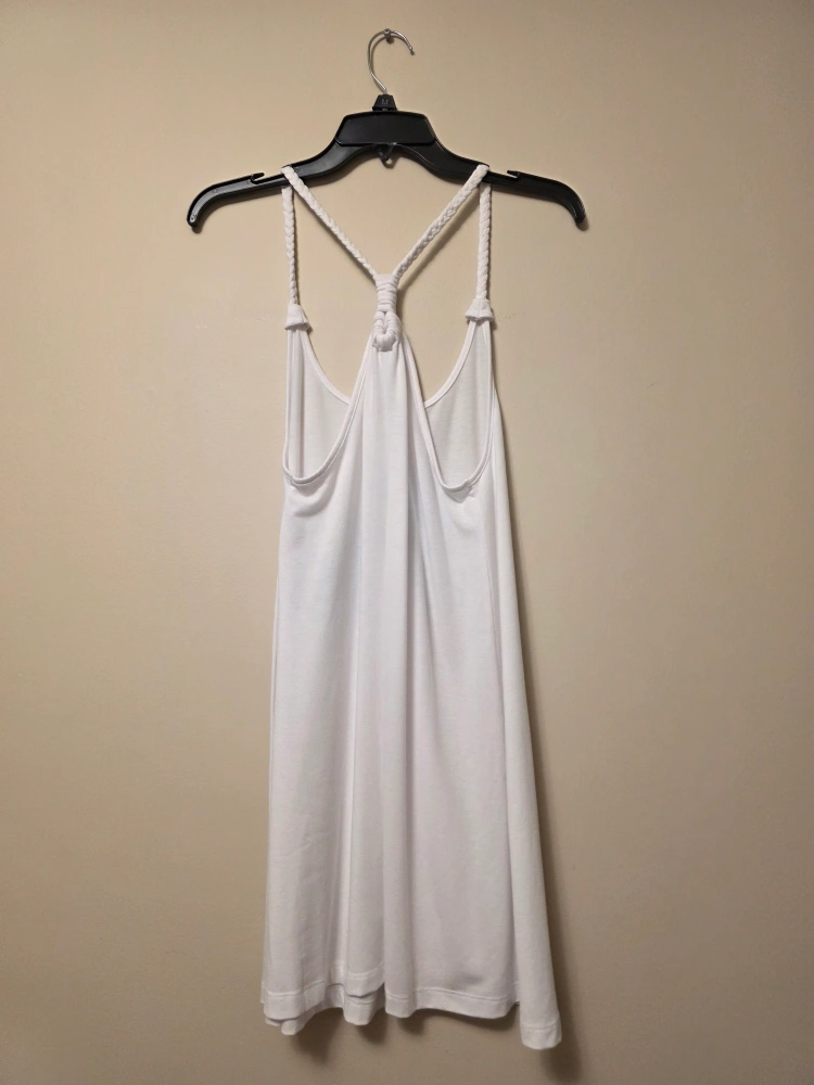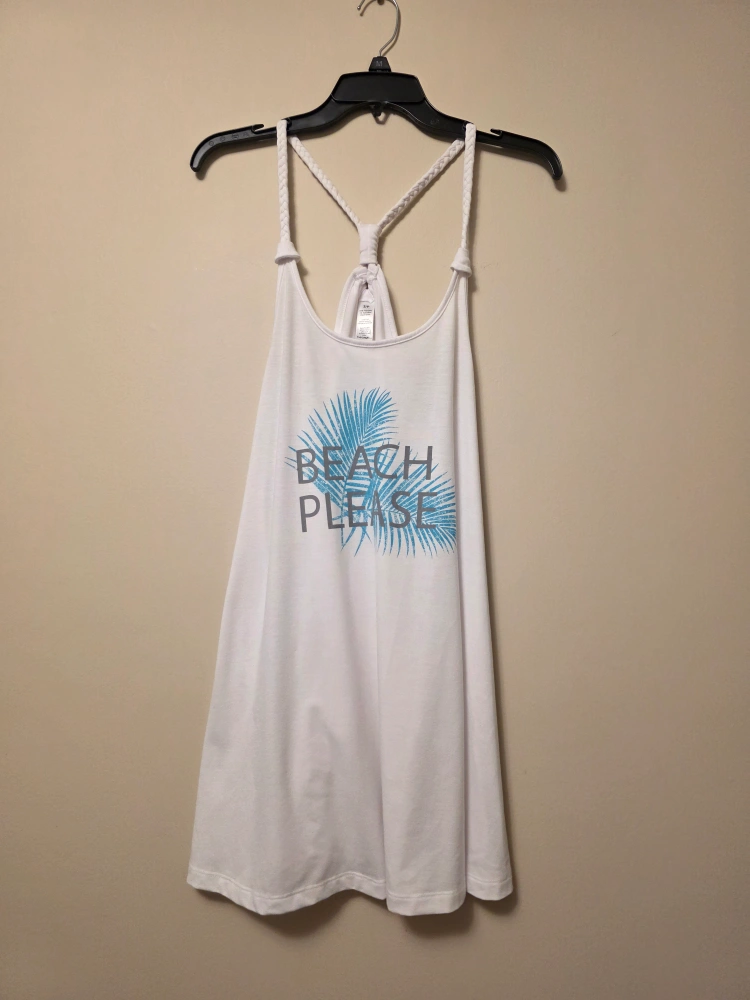I'm selling a cute plaid dress and a white beach/Swimsuit cover up! The dress is a lovely orange and red plaid pattern, perfect for a casual day out, light material, can also be worn on the beach (no linning). this is a small/medium size. The white beach/Swimsuit cover up is a size small and made of 95% polyester and 5% spandex/elastane. It features a unique braided strap design and says "BEACH PLEASE" on the front.