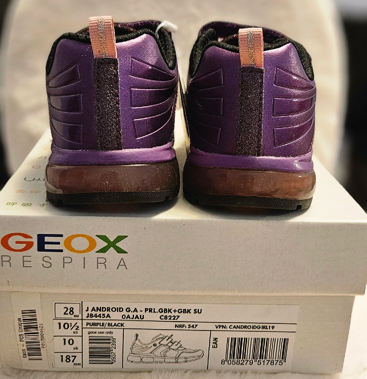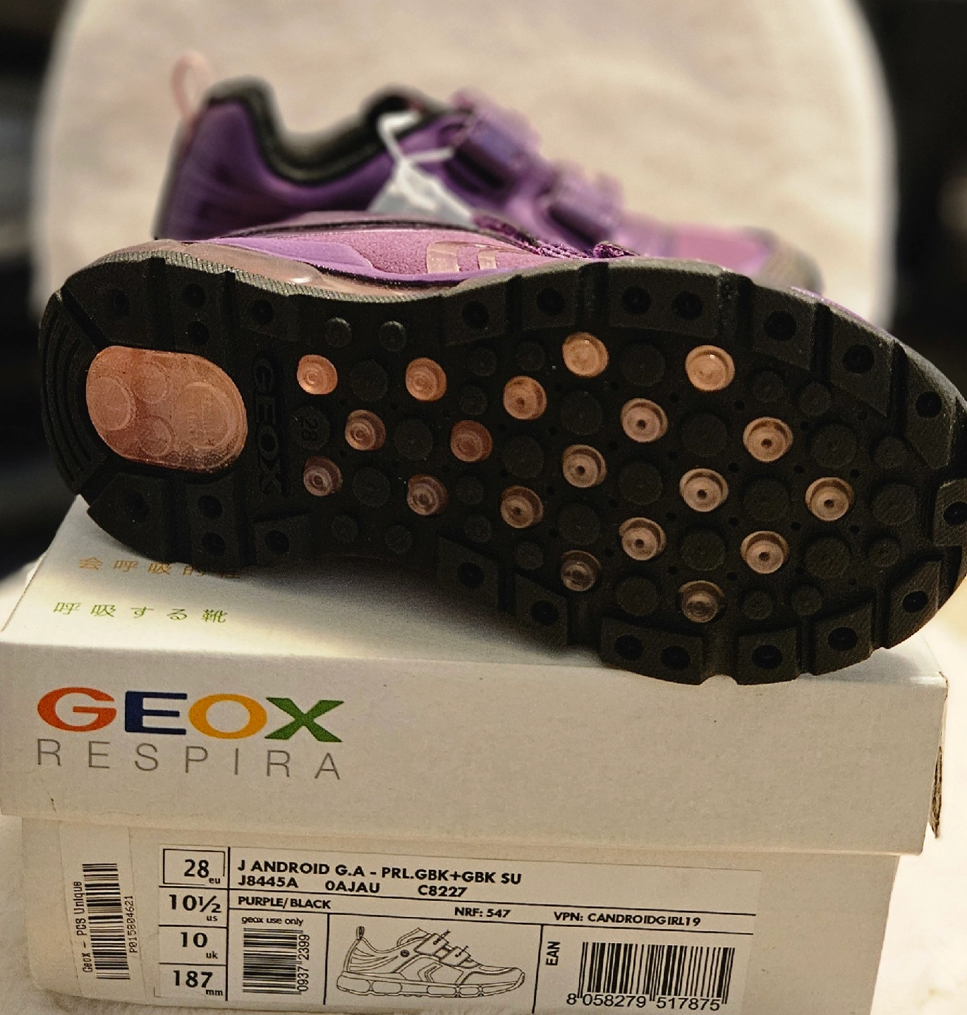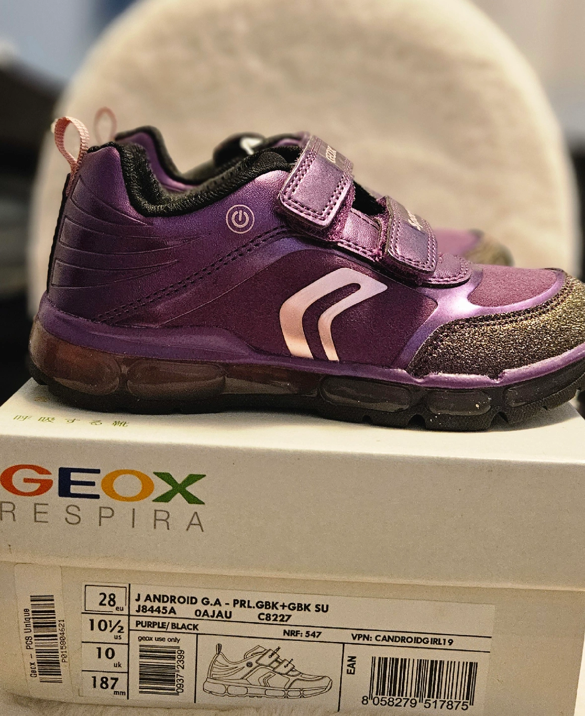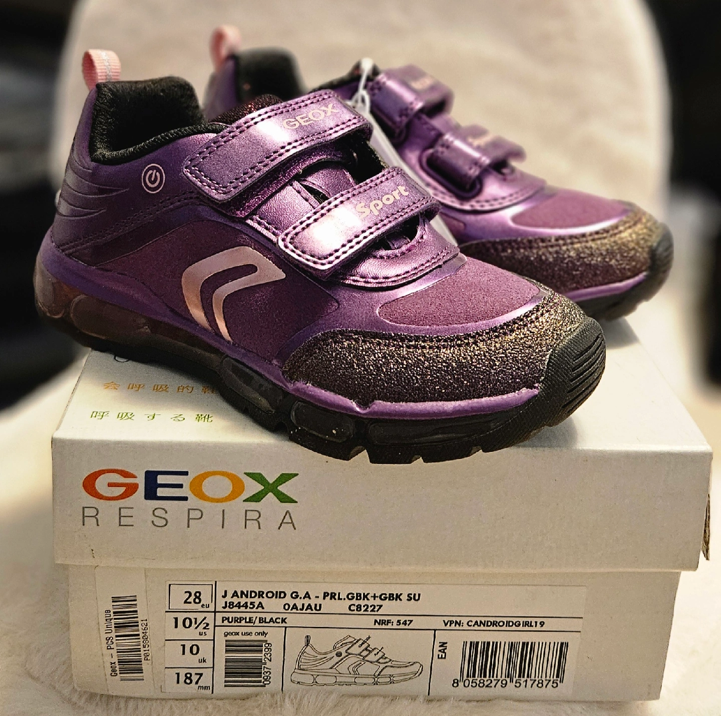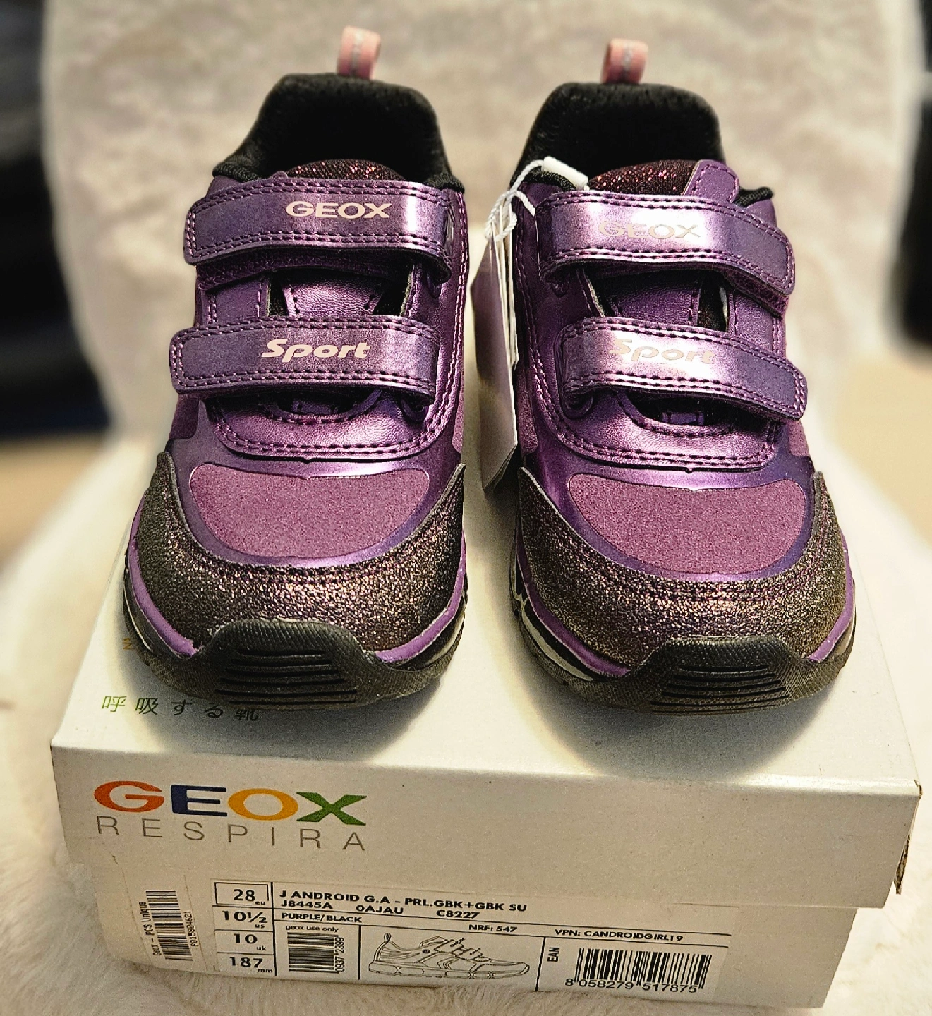 Check out these adorable Geox Android sneakers in a lovely purple and black colour combo! They're a size 10.5 in US sizing. The box is included too! These shoes are perfect for your little one's active lifestyle
