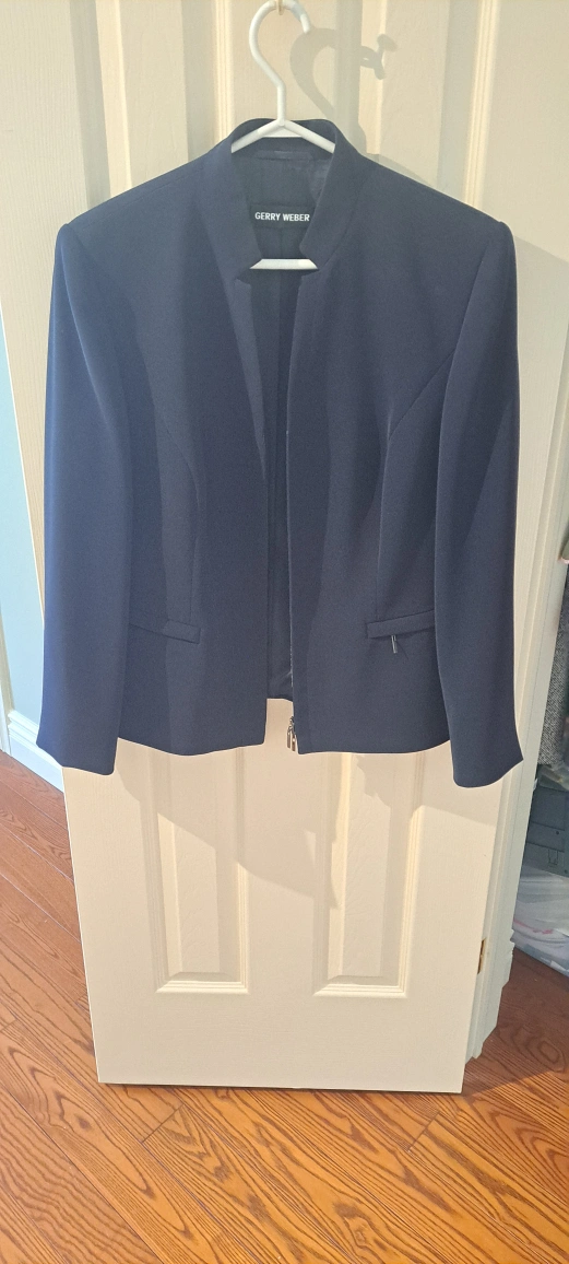 Gerry Weber blazer suit jacket. A dark navy blue. Zipper along the front and on front pockets. Size 12 US.