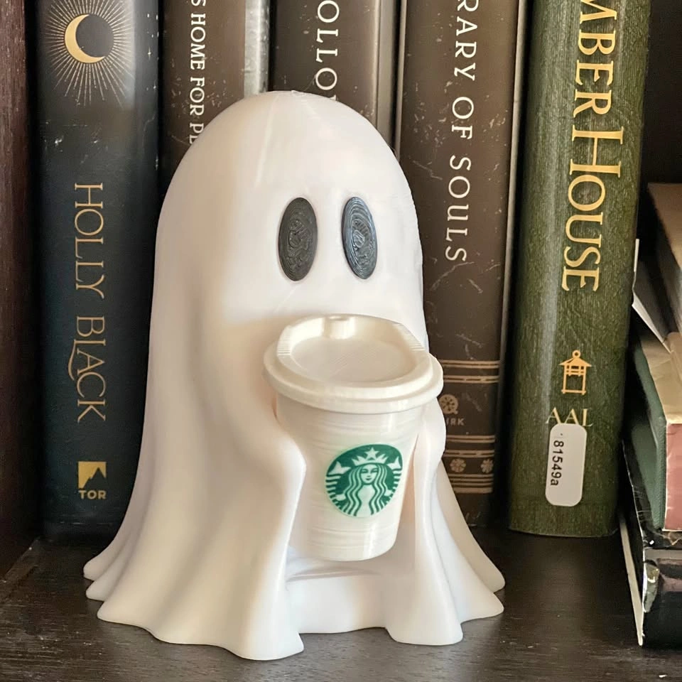 Meet your new spooky shelf buddy! Modelled after the Diet Coke Ghost -This 3D printed ghost is serving serious vibes — complete with its own tiny coffee cup. Whether you're a book lover, Halloween fan, or just need a little ghostly charm in your space, this haunt has you covered. Perfect for gifting or decorating your favourite bookshelf, desk, or gaming setup. Printed with high-quality filament for a smooth finish and sturdy feel. The ghost stands approximately 5.75 inches tall and comes with one coffee cup of your choice (plain, Starbucks, Tim Hortons or McCafe) Available now — limited quantities! Message to claim yours.