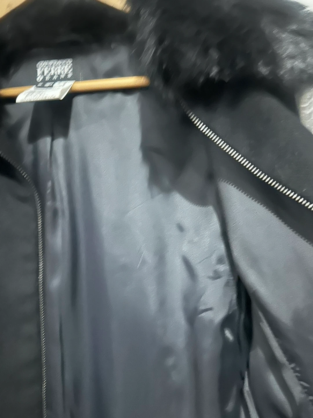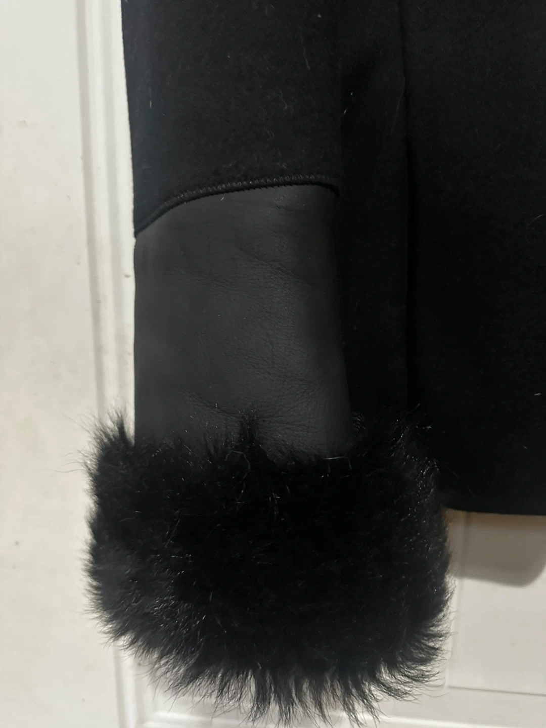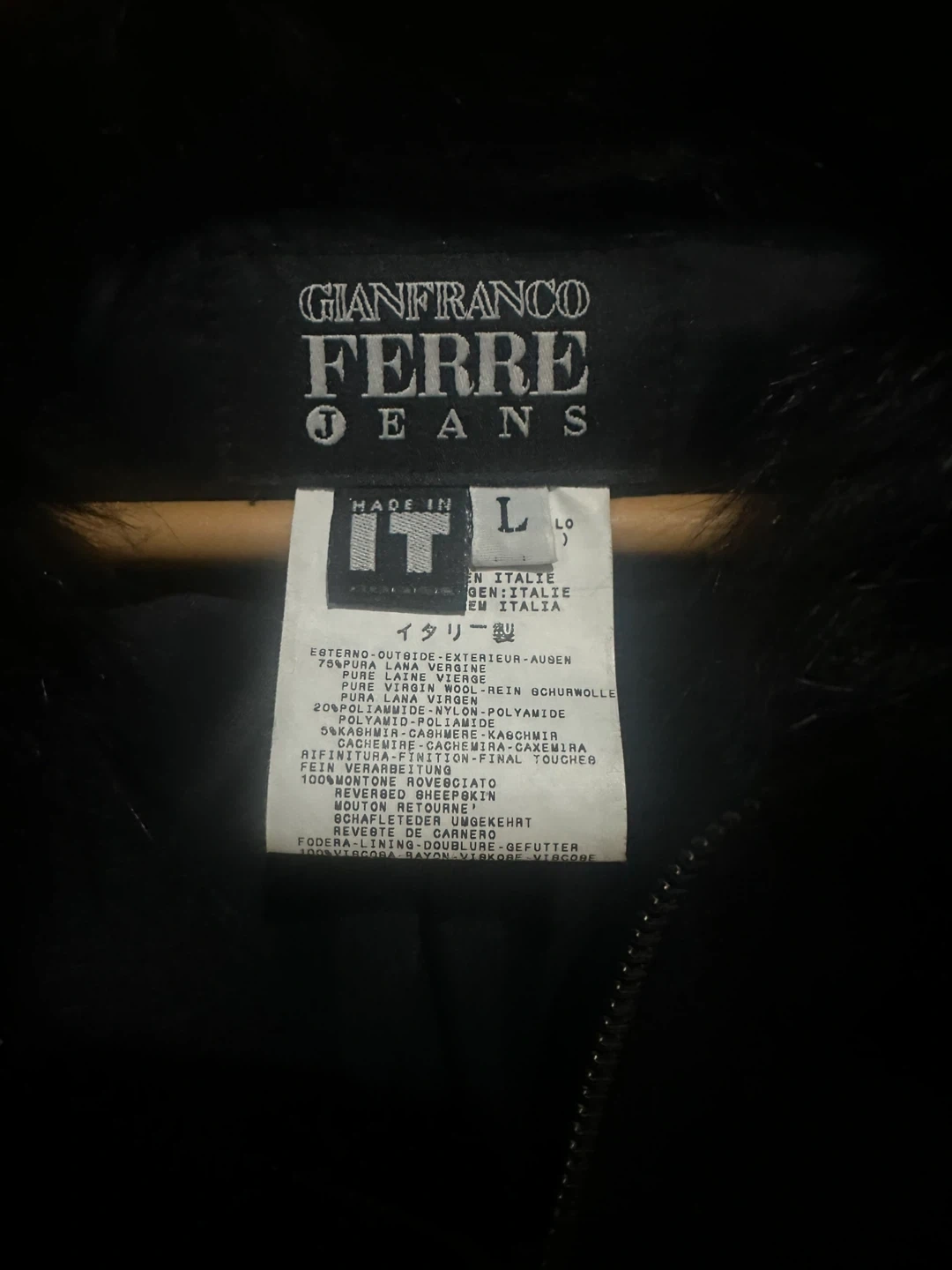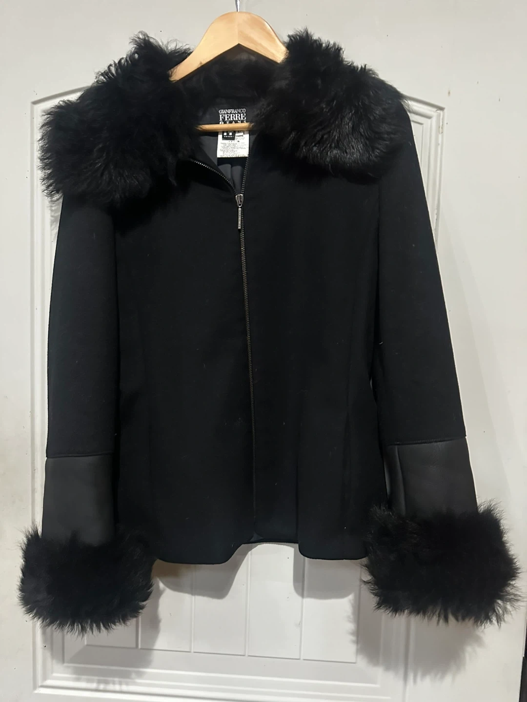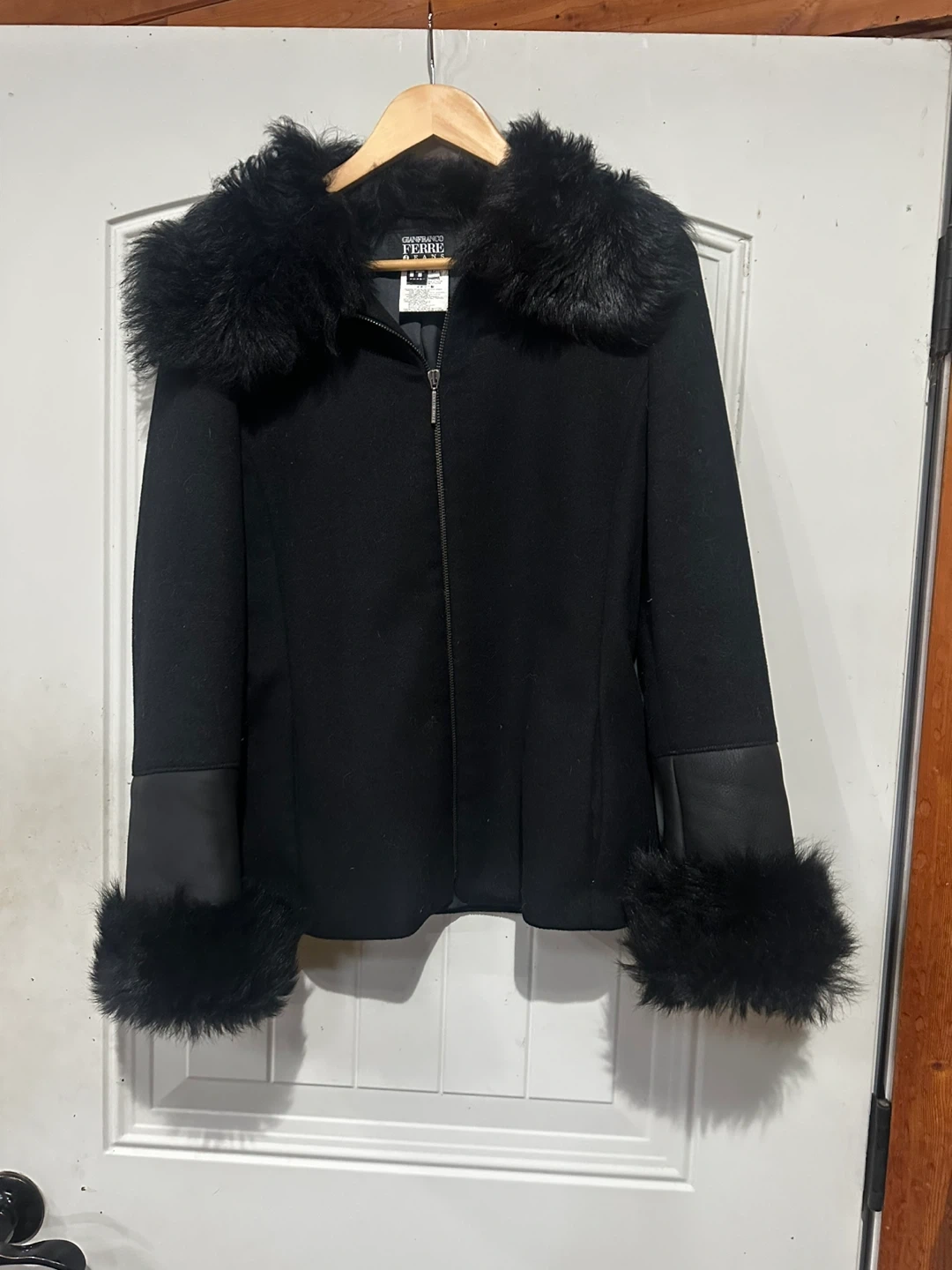 Selling a stylish Gianfranco Ferre jacket in size L! This black wool jacket features unique fur trim and leather detailing on the sleeves. Made in Italy, it's composed of 75% pure virgin wool and 20% polyamid-polyamide, with 5% cashmere. A fashionable and cozy addition to any wardrobe!