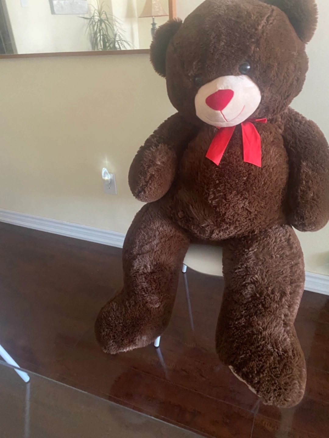 Large brown teddy bear. Features red hearts on paws and chest. Soft plush material. Red ribbon bow around neck. Great for cuddling or decoration and an amazing gift for loved ones. Like new. ๐๐๐๐