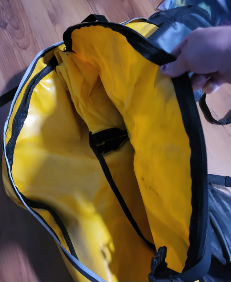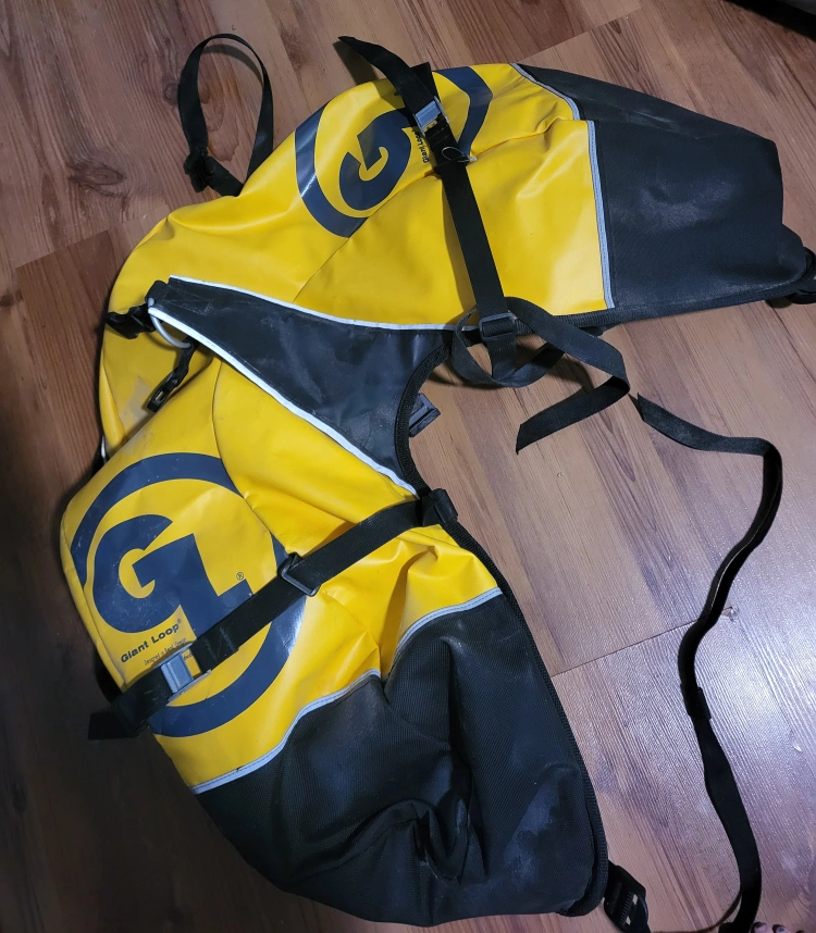 Selling a Giant Loop pannier bag in yellow and black. Used on motorcycles, it is durable and can carry a lot of gear. It shows some signs of use but is still in good condition for many more trips.