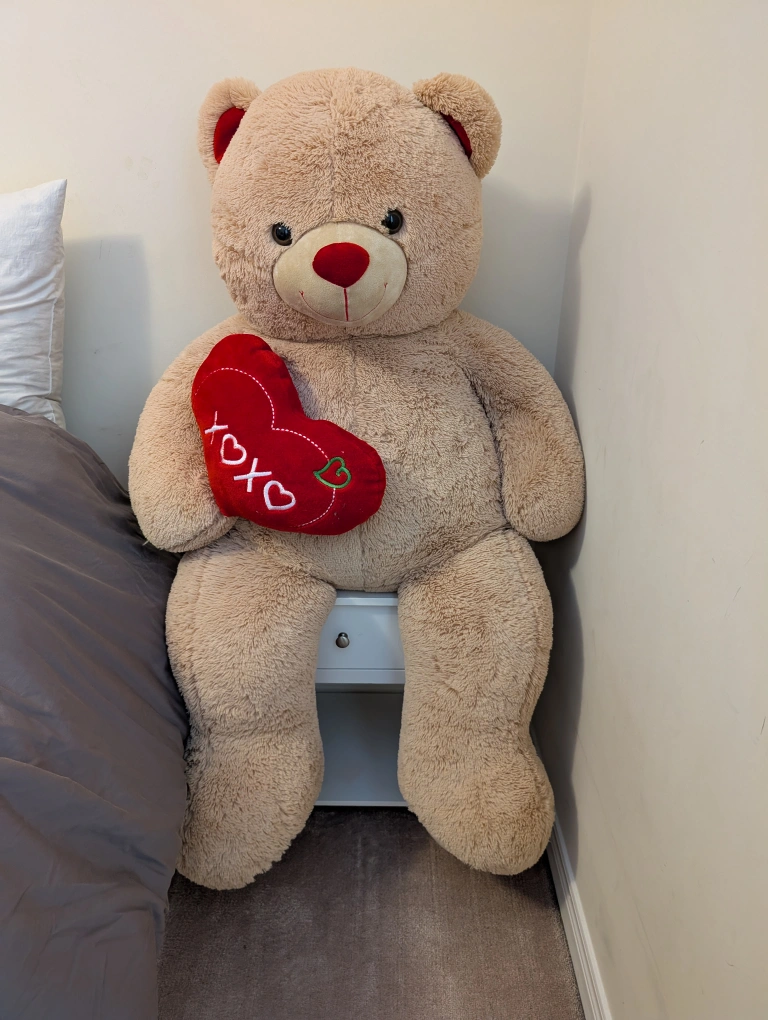 Selling a large, cuddly teddy bear holding a heart with 'XOXO' on it! It's in great condition and ready to be loved by someone new