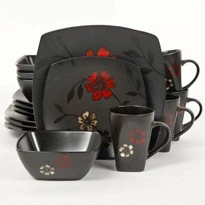 The Gibson Elite Evening Blossom dinnerware set features a black satin design with blossoms in pops of white and red color. This sixteen piece ceramic set by Gibson includes 4 dinner plates 4 salad plates 4 bowls & 4 mugs. Dinnerware set is dishwasher safe and microwave safe. new in box, will also include some extra pieces from another set.