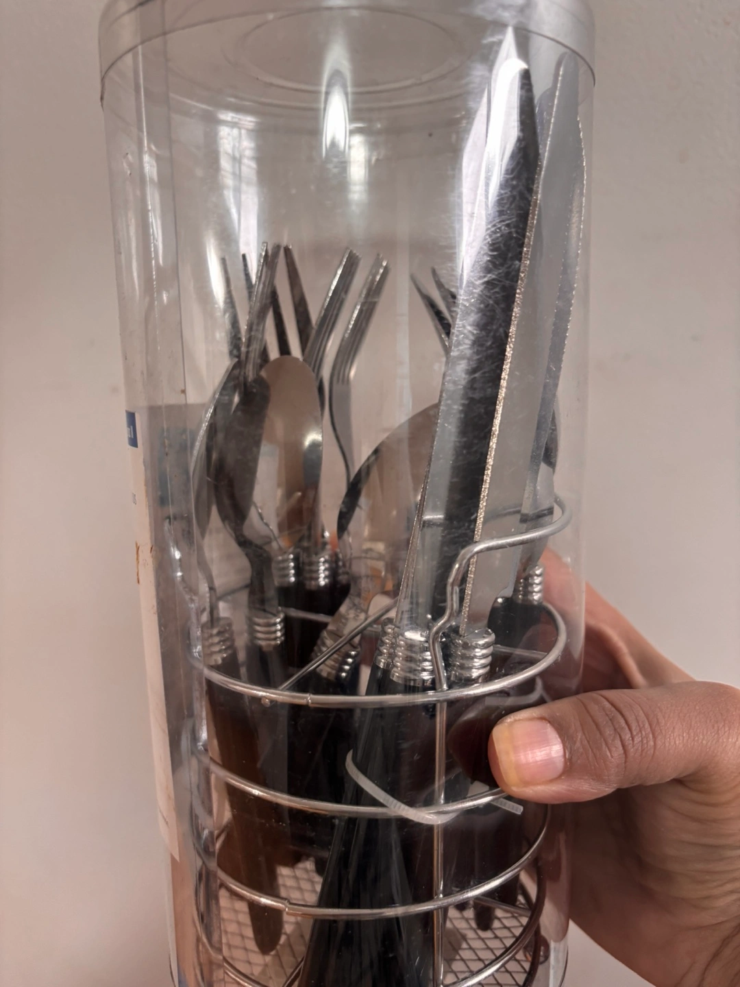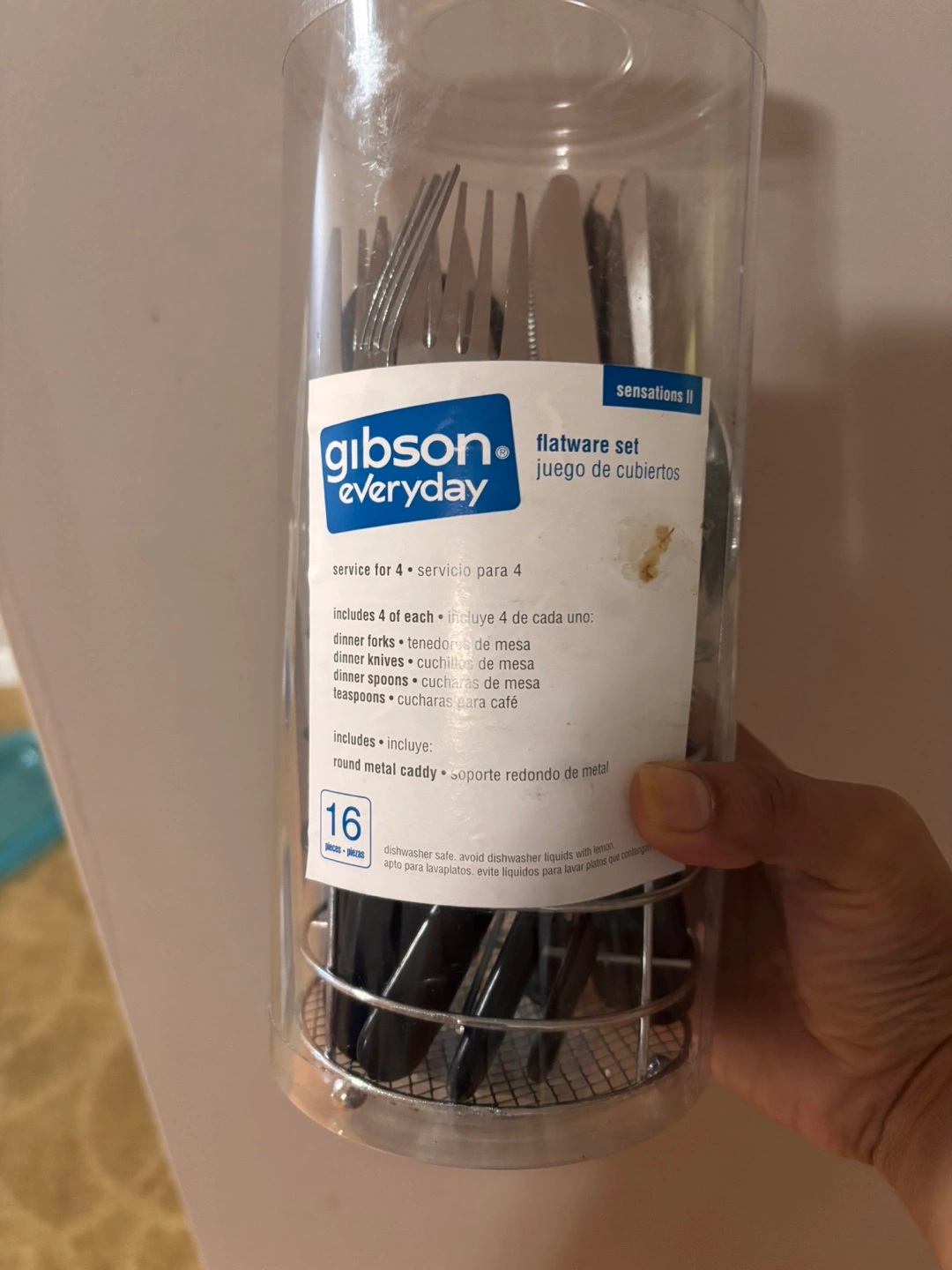 Selling a Gibson Everyday flatware set, service for 4! The set includes 4 each of dinner forks, dinner knives, dinner spoons, and teaspoons. It also comes with a round metal caddy, super handy for keeping everything organized
