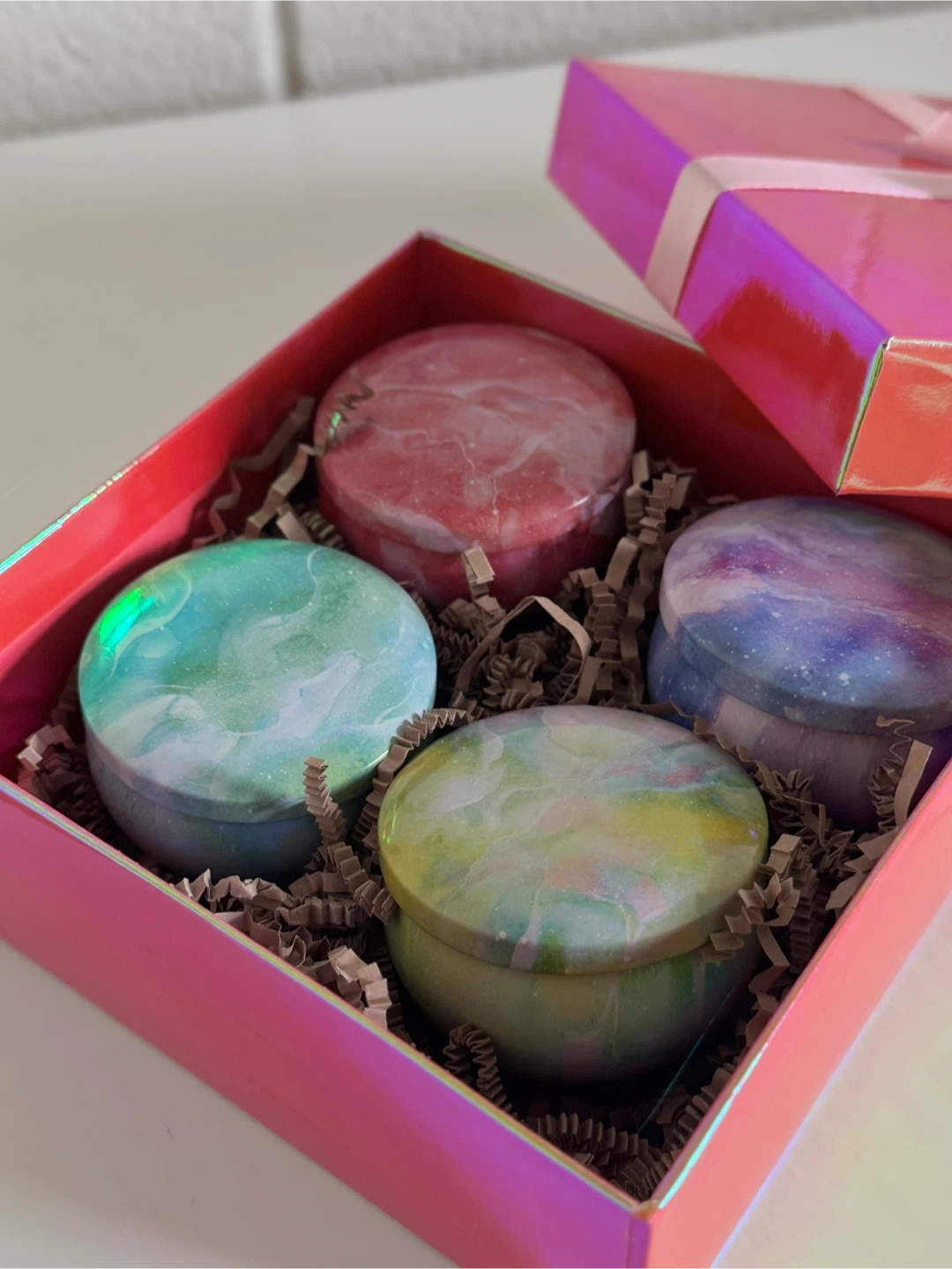 Gift Box Set β Handmade Natural Candles in Marble Jars (4 pcs, 2.5 oz/ea) Hand-poured candles made from 100% natural soy wax in elegant marble jars. π― The set includes 4 mini candles (2.5 oz each), with every jar featuring a unique marble design. π΄ Scent β Fiji Coconut: fresh, tropical, and light, bringing a touch of relaxation and comfort. πΏ Natural composition: soy wax and fragrance oil free from parabens and phthalates. π Beautifully packed in a stylish gift box with a ribbon β a ready-to-give present for loved ones or a chic addition to your home dΓ©cor. β¨ Features: β’ 100% natural soy wax β’ Clean and eco-friendly burn β’ Paraben & phthalate free β’ Each jar is one-of-a-kind