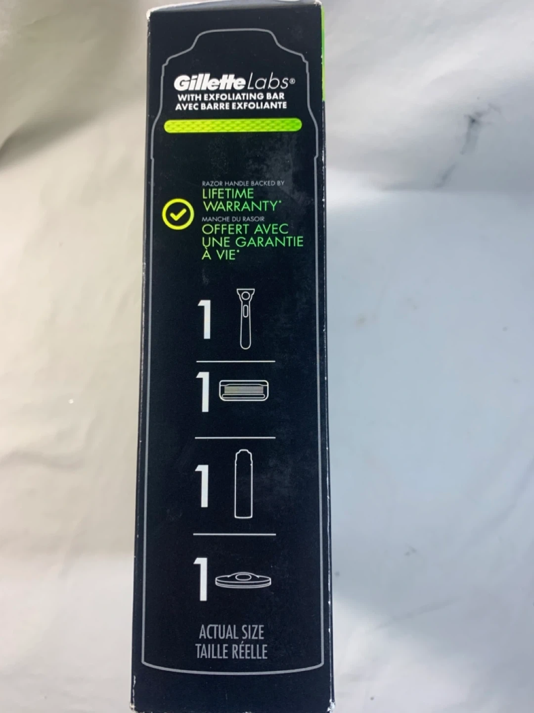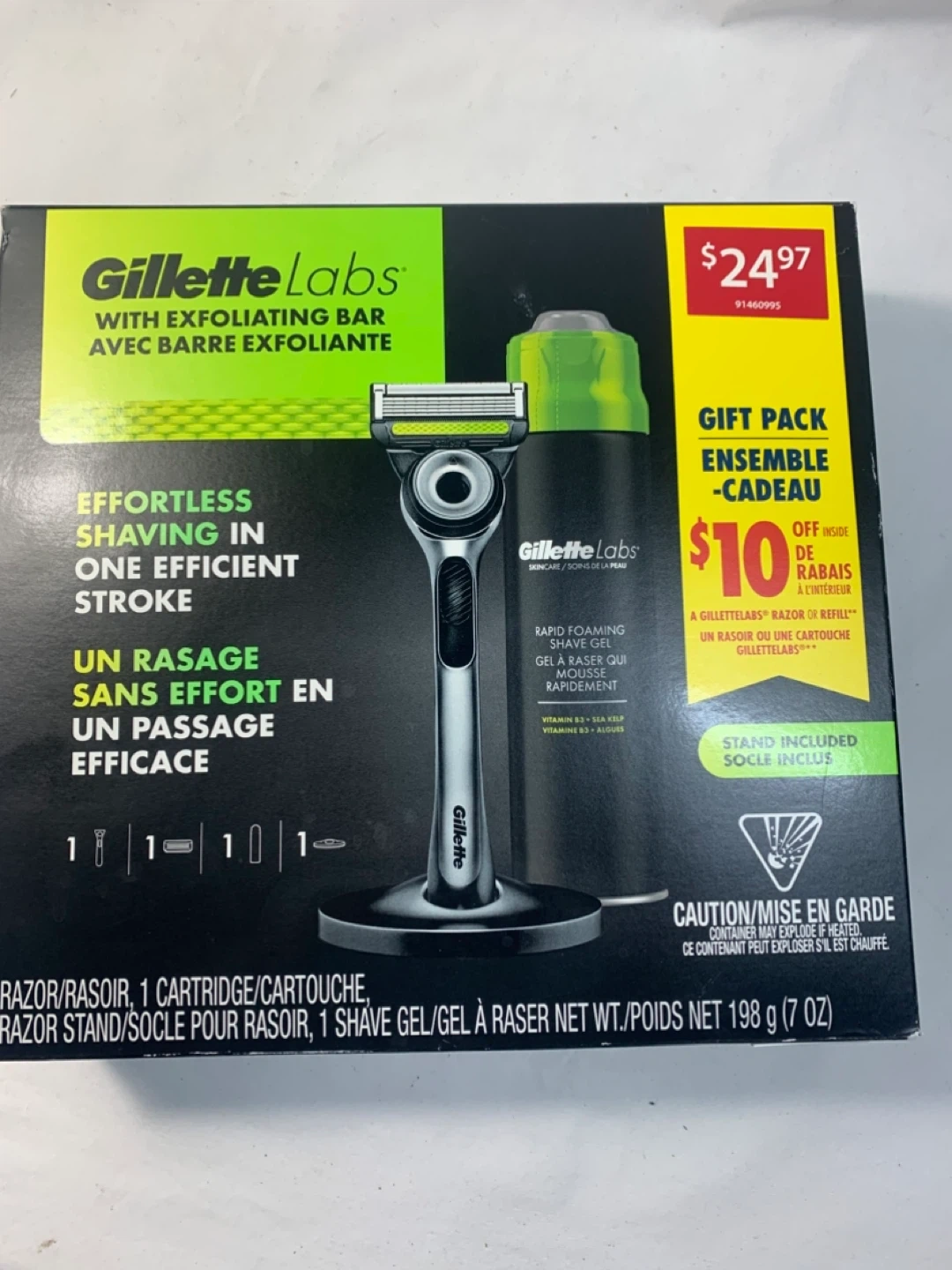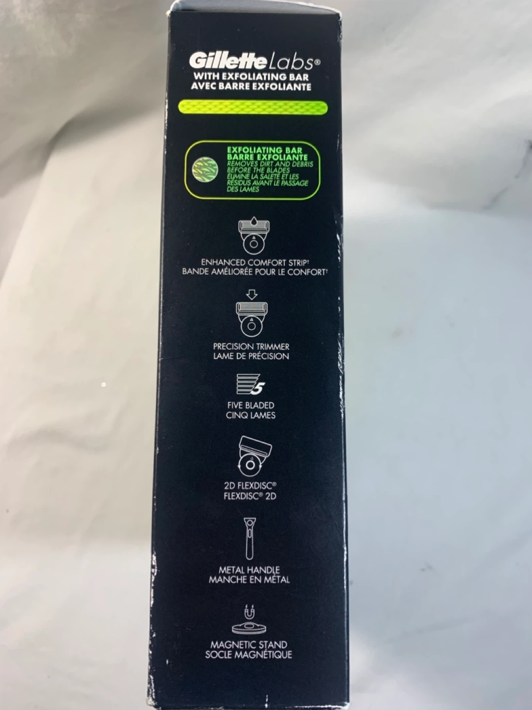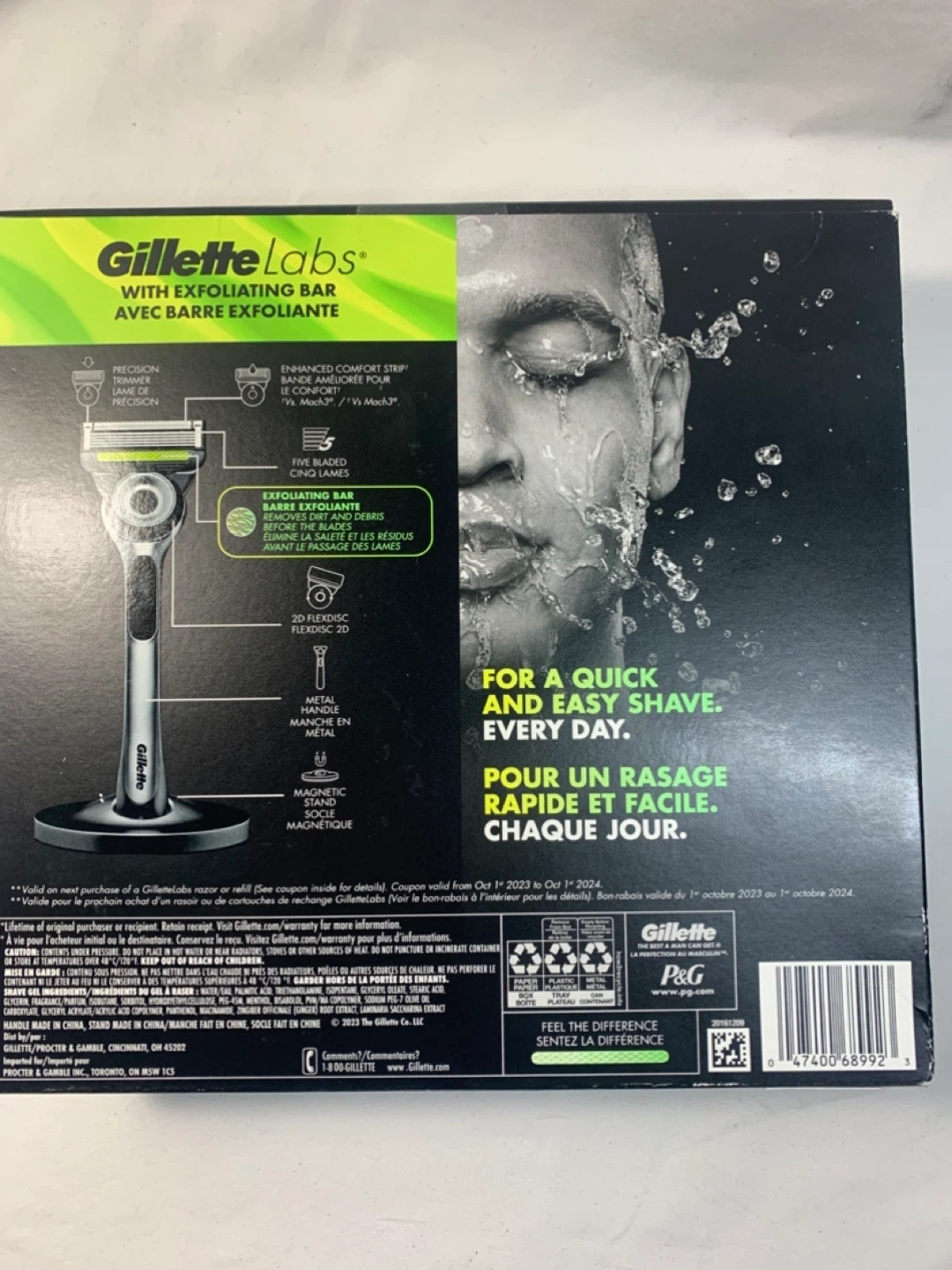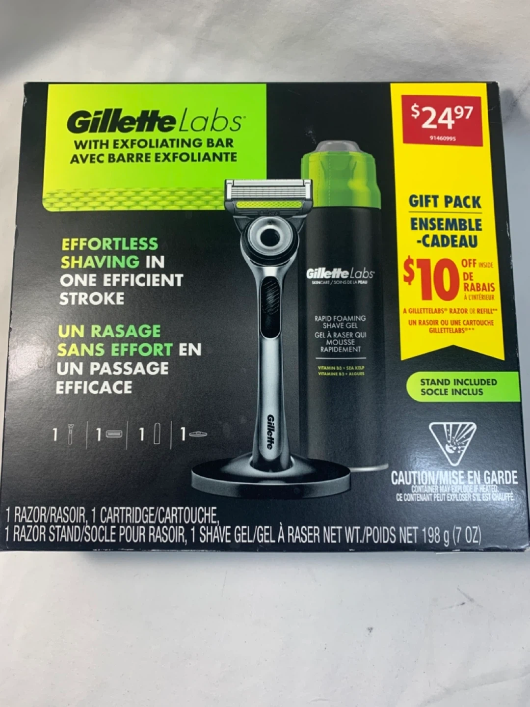 GilletteLabs with Exfoliating Bar gift pack includes: - Razor - Cartridge - Razor stand - Shave gel Features a magnetic stand, metal handle, and 2D FlexDisc