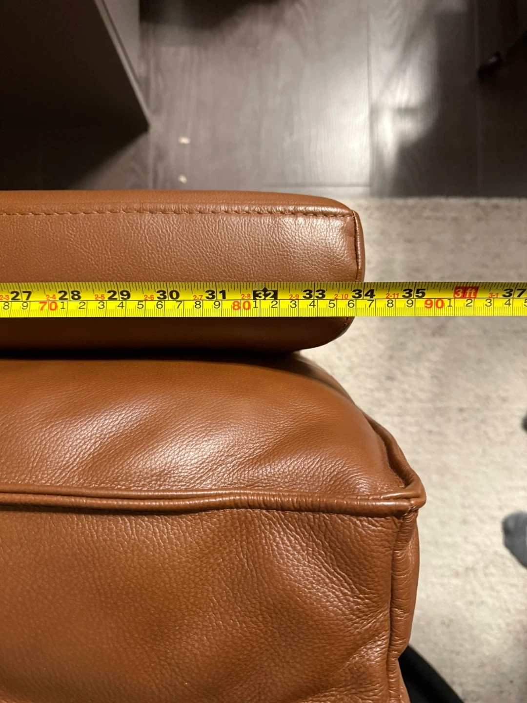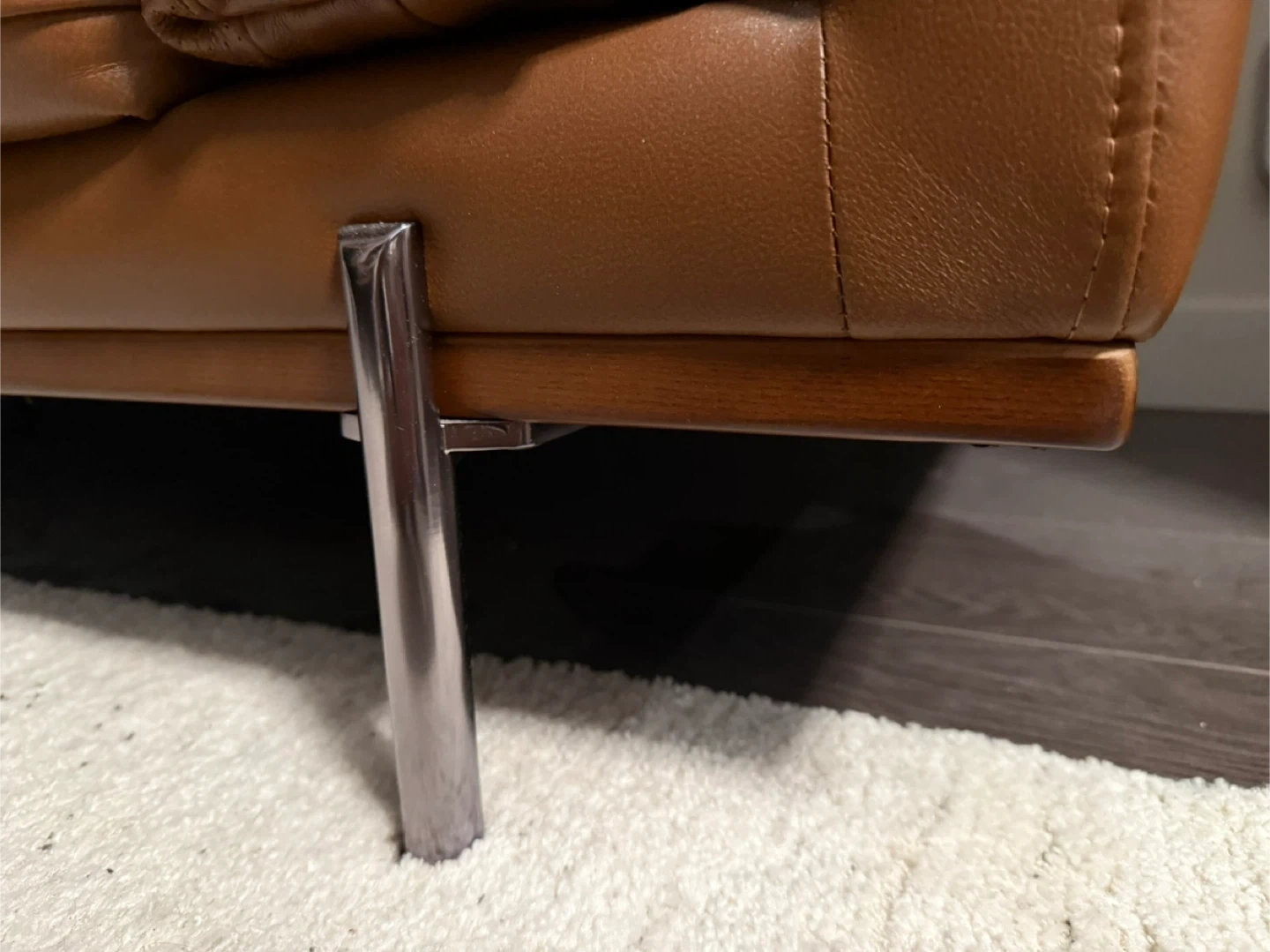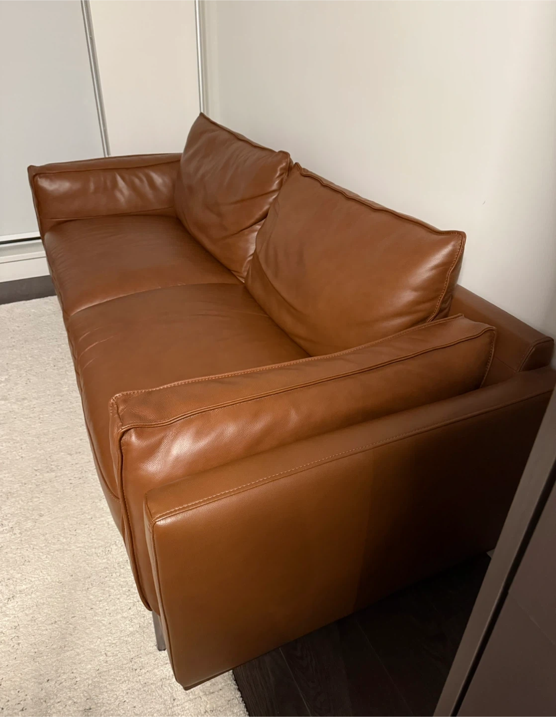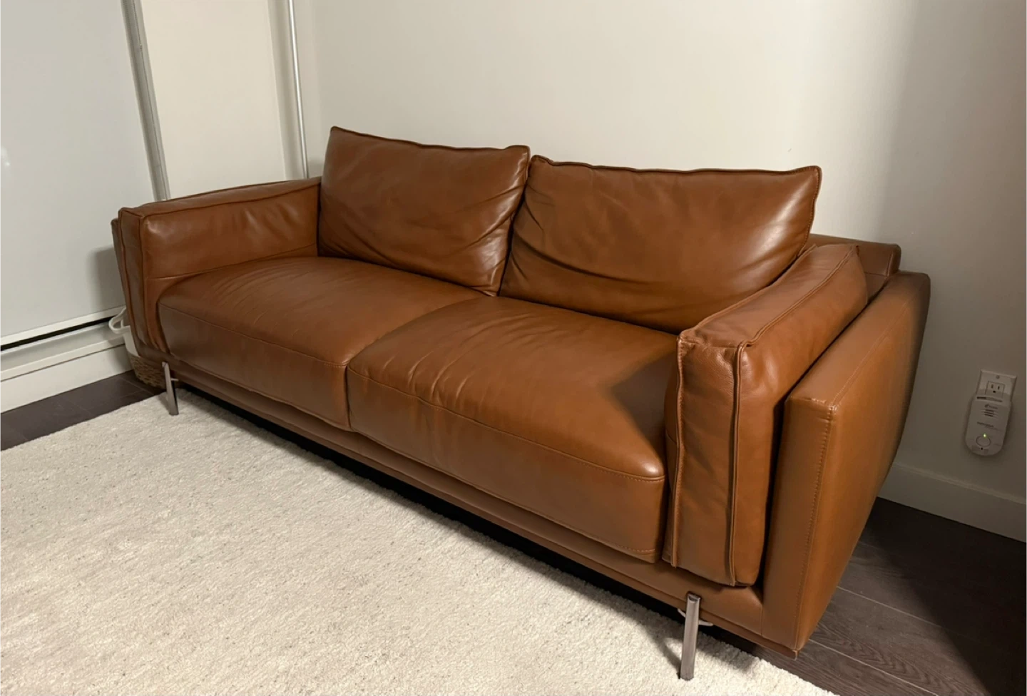 Selling a comfy Gilman Creek brown top grain leather sofa. It measures approximately 84 inches in length. It has a solid wood base and sleek metal legs. Pet free and smoke free home. It's in great shape and ready for a new home!