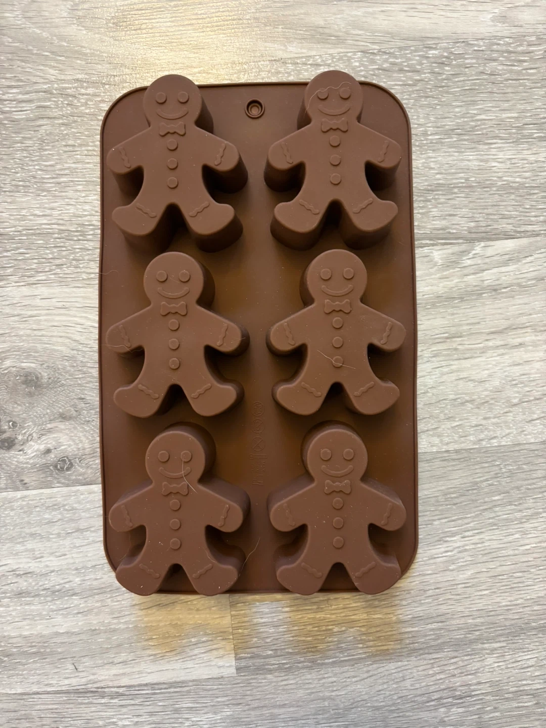 Selling a gingerbread man silicone mold! This mold makes six gingerbread men at a time. It's perfect for baking cookies, making chocolates, or even crafting with clay. It's brown and in great condition