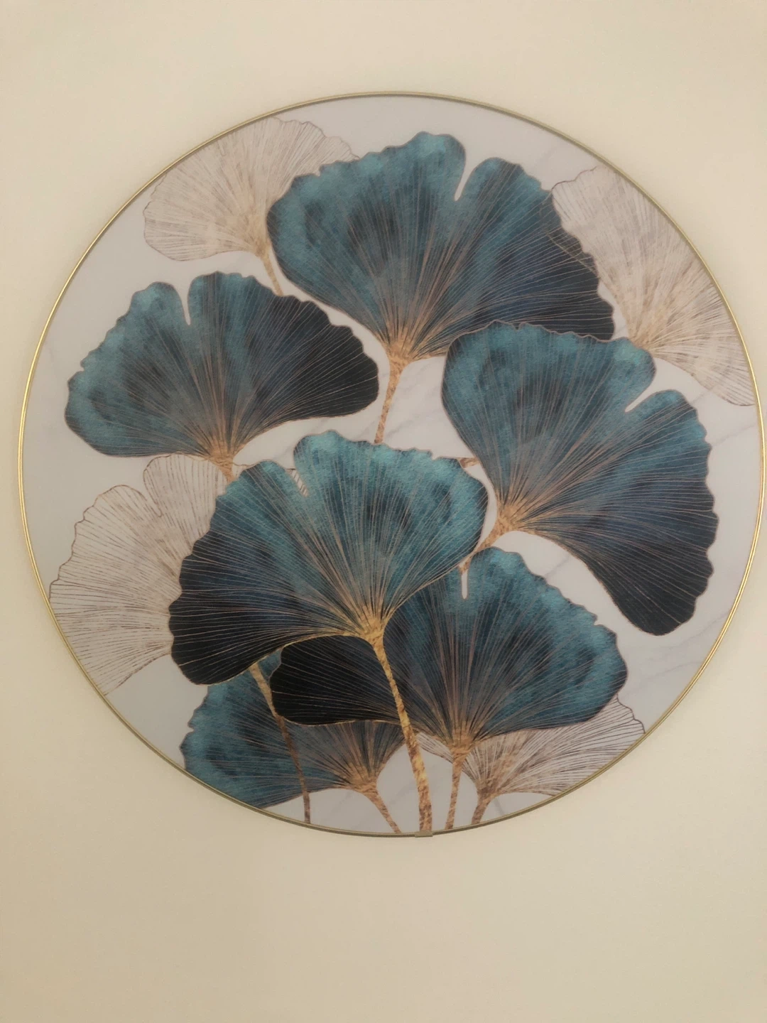 A beautiful piece of wall art featuring a ginkgo leaf design. It has a modern and elegant look with blue and white leaves and a gold trim. Perfect for adding a touch of nature to your home decor