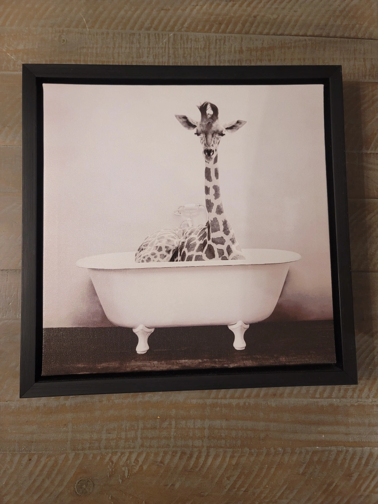 Framed canvas print featuring a giraffe in a bathtub. It's in great condition and ready to add a touch of whimsy to your space! SIZE 14 x 14