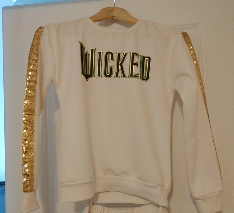 Super cute with 'Wicked' printed on the front and gold sequin sleeves! It's in great condition and ready for a new home Size small