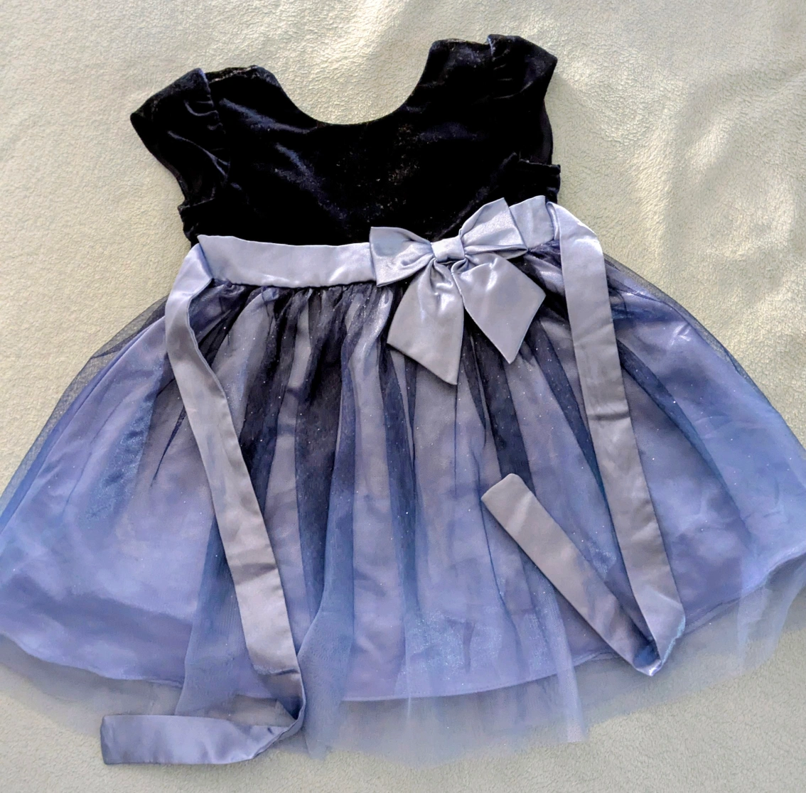 A cute little dress for a special occasion! It features a black velvet top and a layered blue skirt with a touch of sparkle. A lovely silver bow adds a sweet detail to the waist