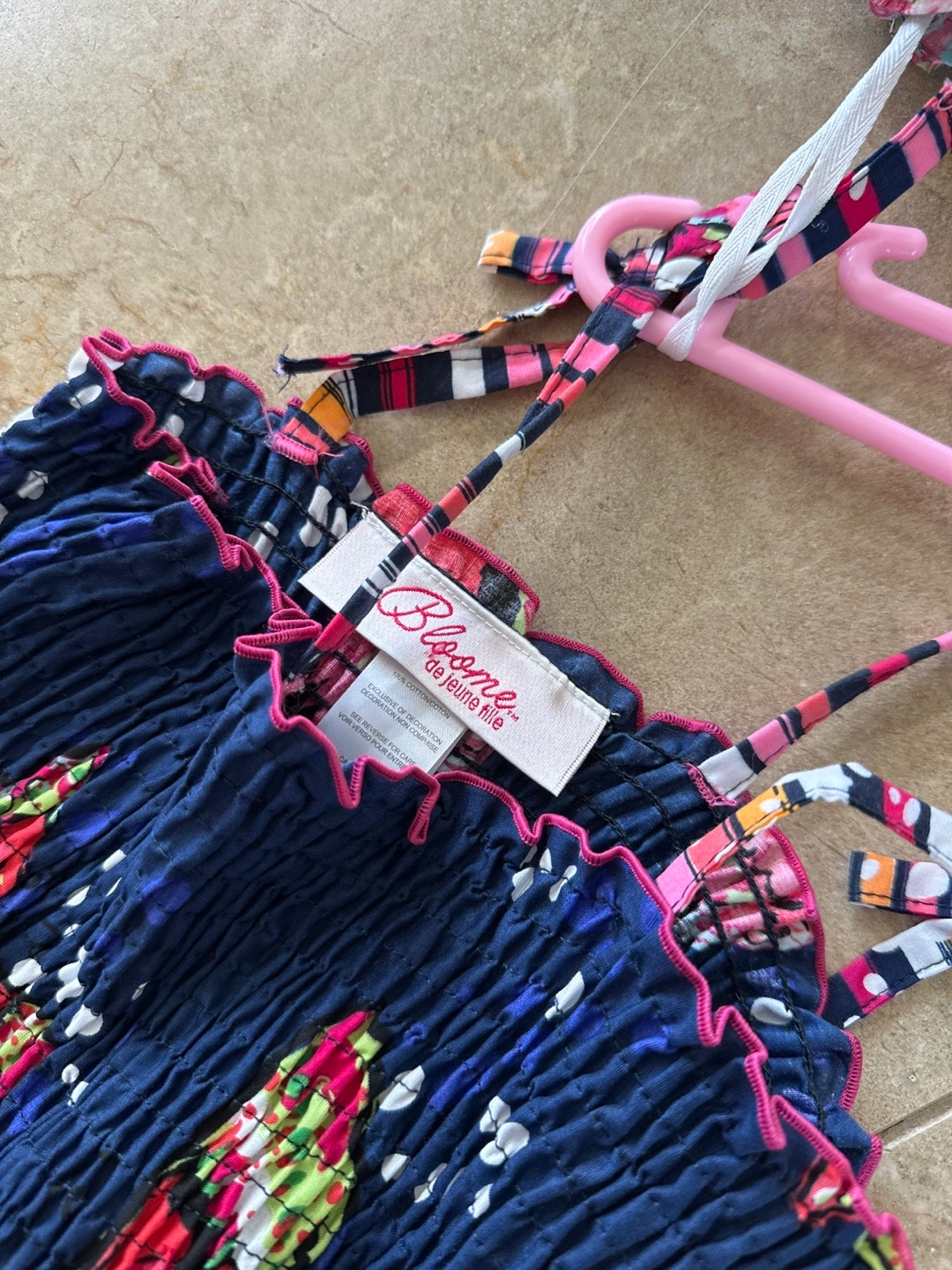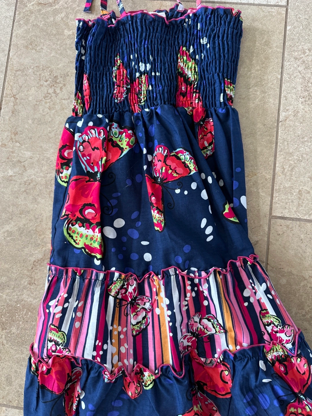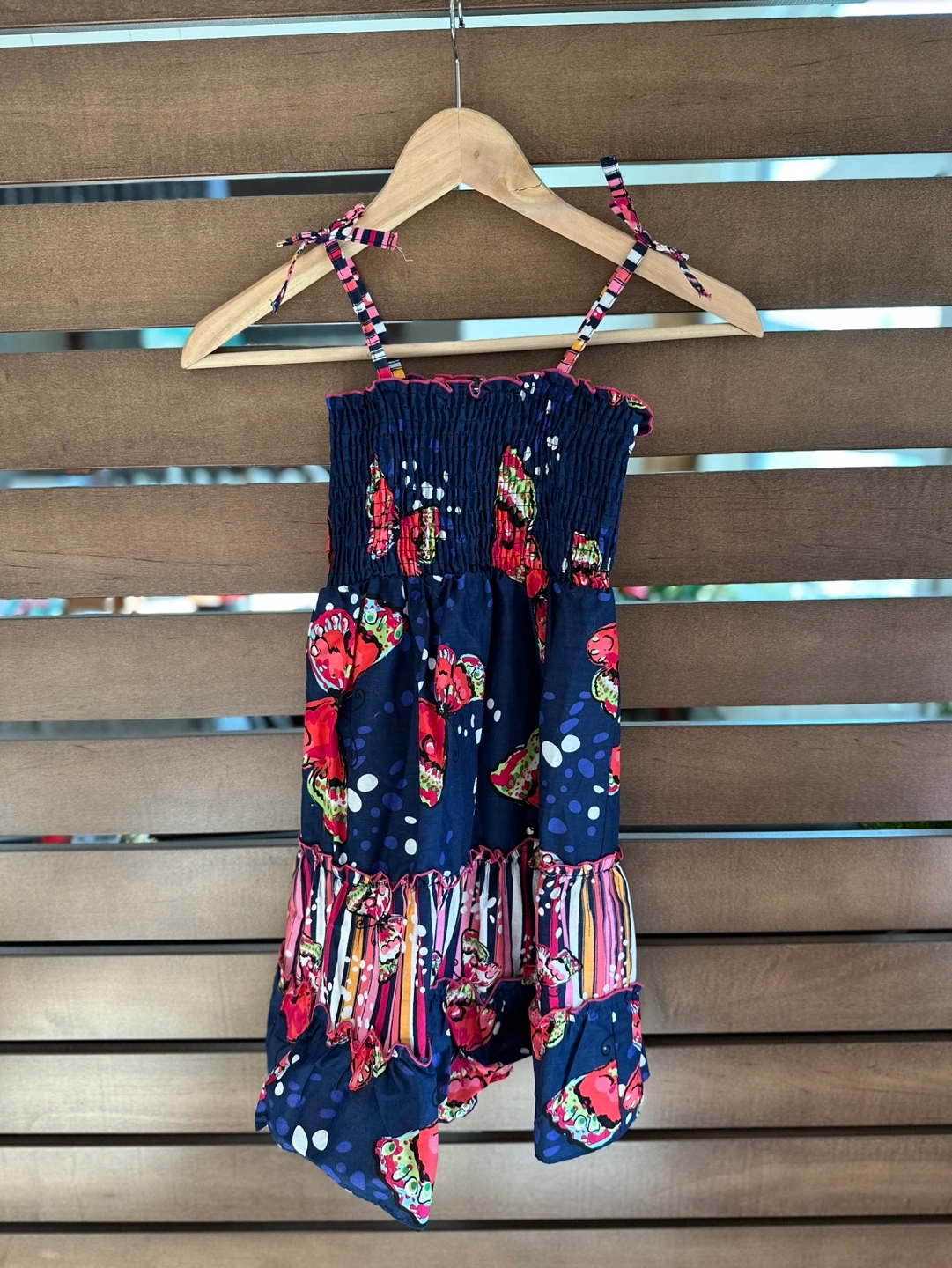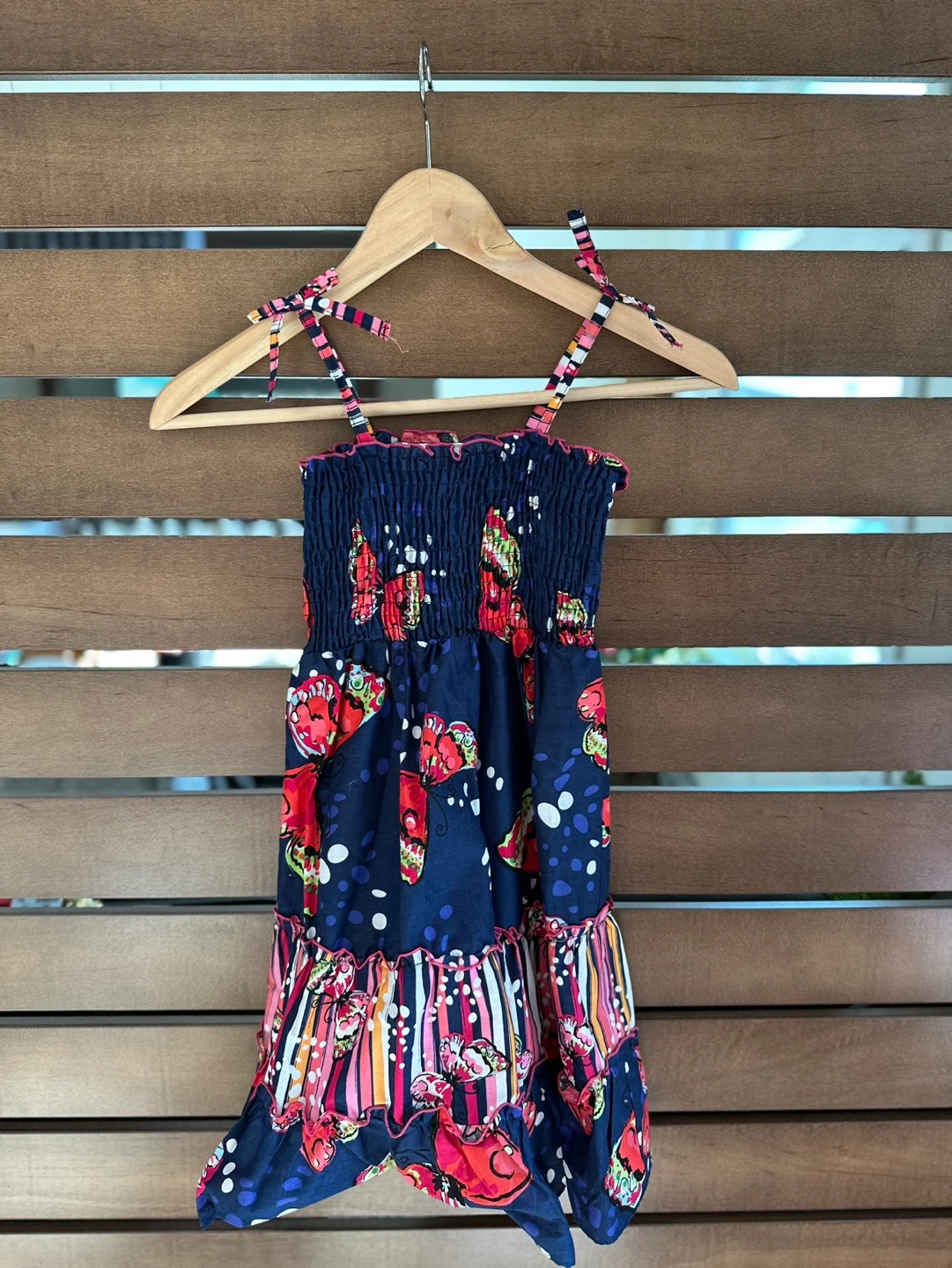Adorable little girls' summer dress. Ruche elastic top and layered bottom skirt. Features a navy blue base with colourful butterfly print. Adjustable straps. Perfect for parties or playtime.
