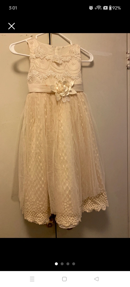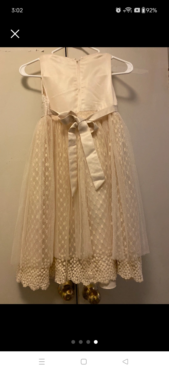 Adorable champagne-coloured flower girl dress. Features delicate lace detailing, a satin bodice, and a tulle skirt. Beautiful flower accent at the waist. Perfect for special occasions.