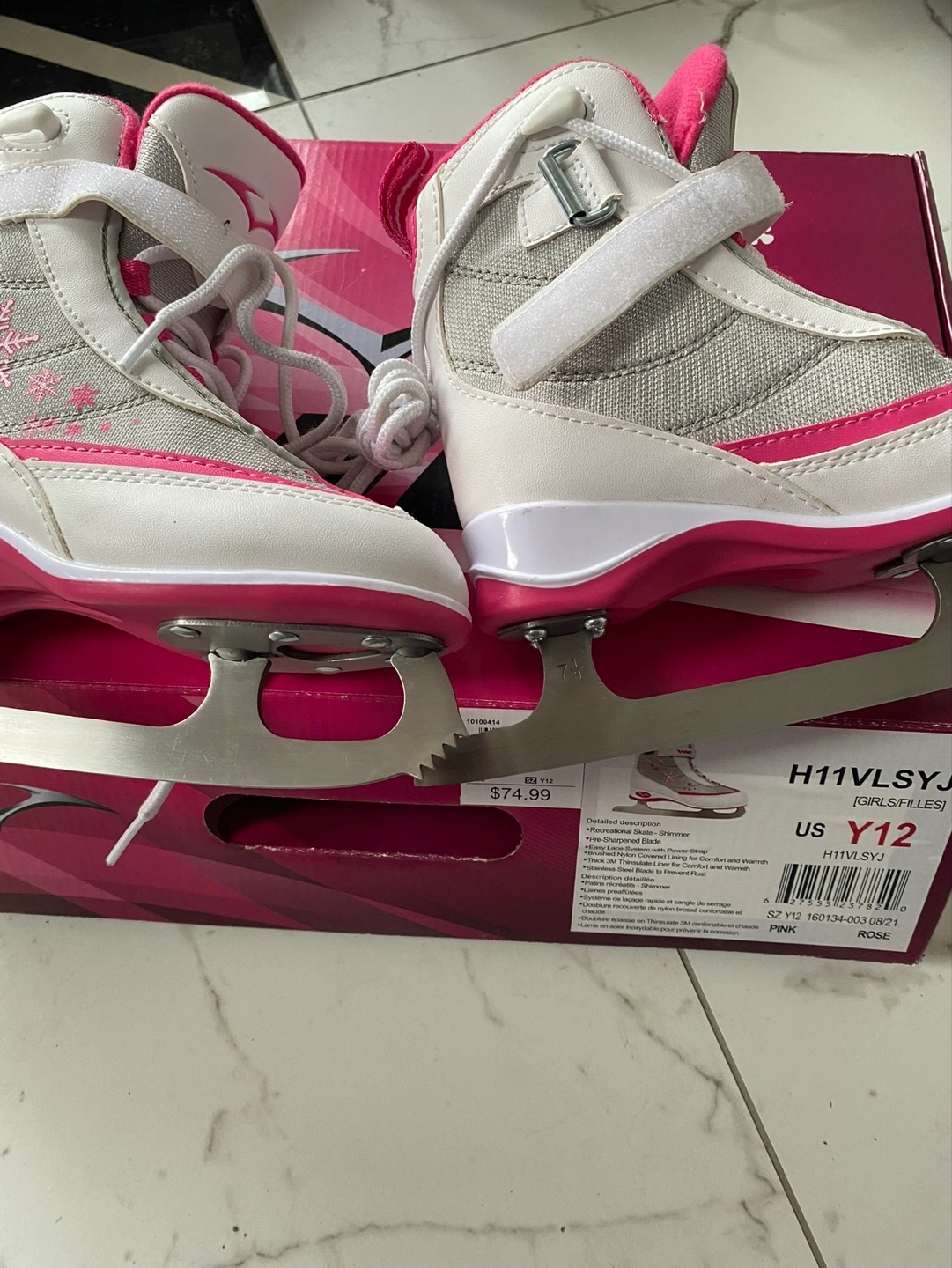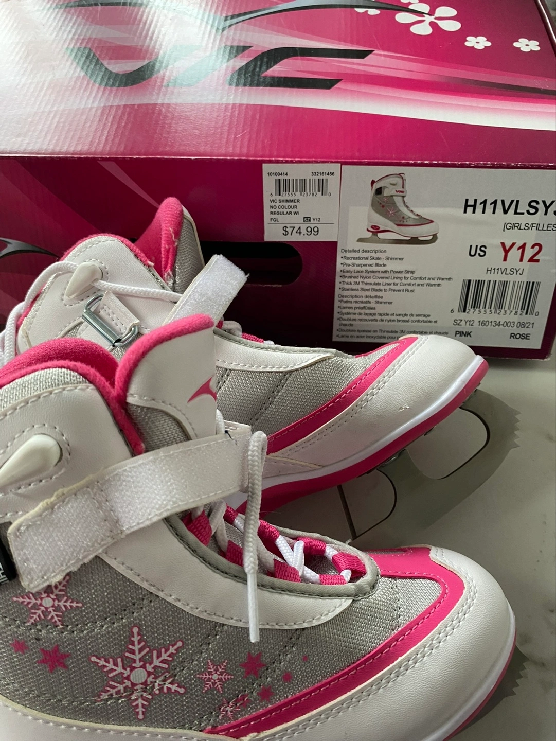 New pair of girls' figure skates. Size Y12. Pink and grey colour scheme. Snowflake design. Pre-sharpened blades.