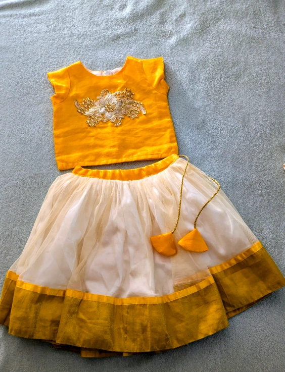 A beautiful two-piece Indian dress for girls, featuring a vibrant yellow top with delicate embellishments and a lovely white skirt with a yellow border. Perfect for special occasions or cultural events! The dress is in great condition and ready for a new home