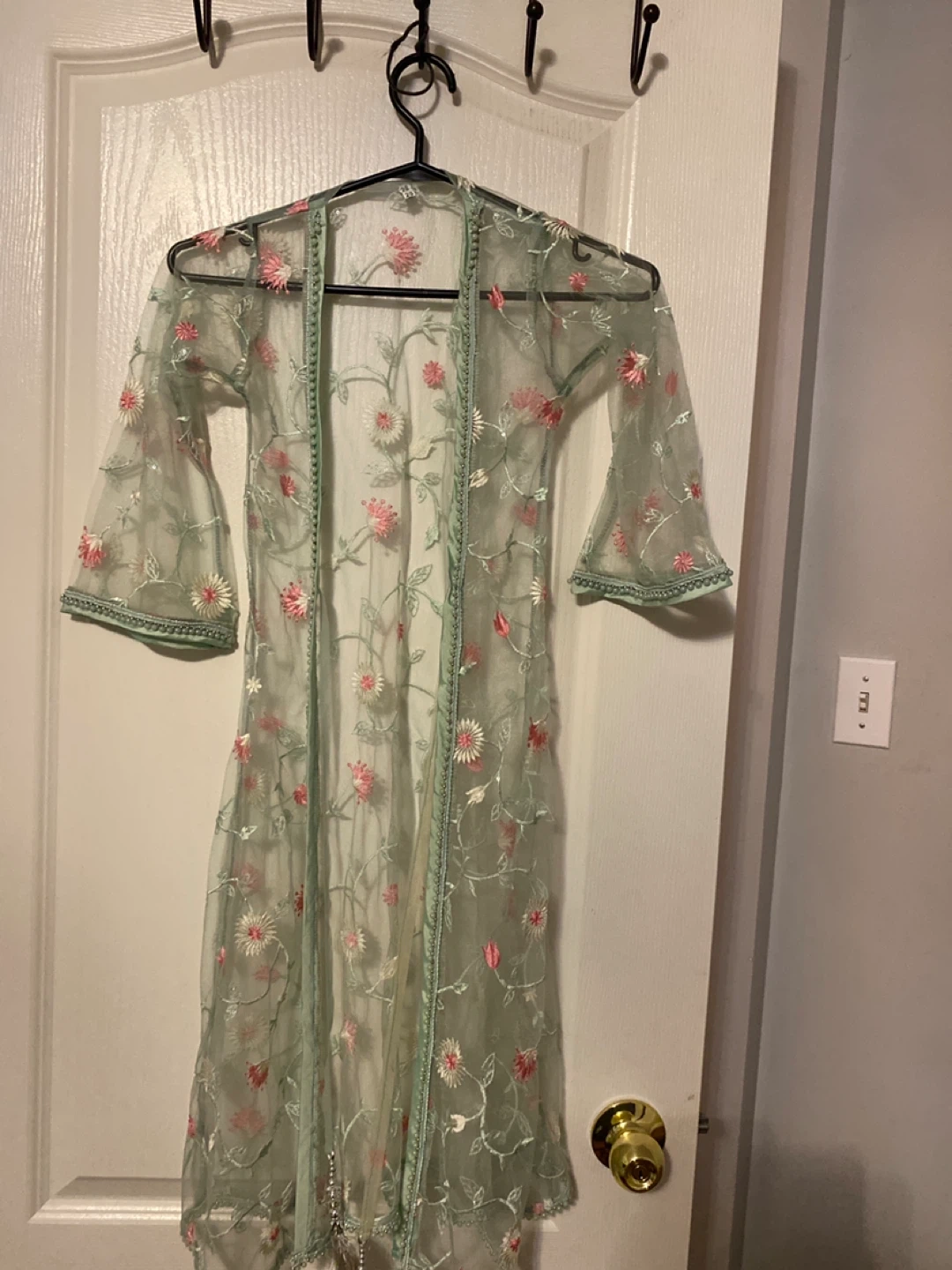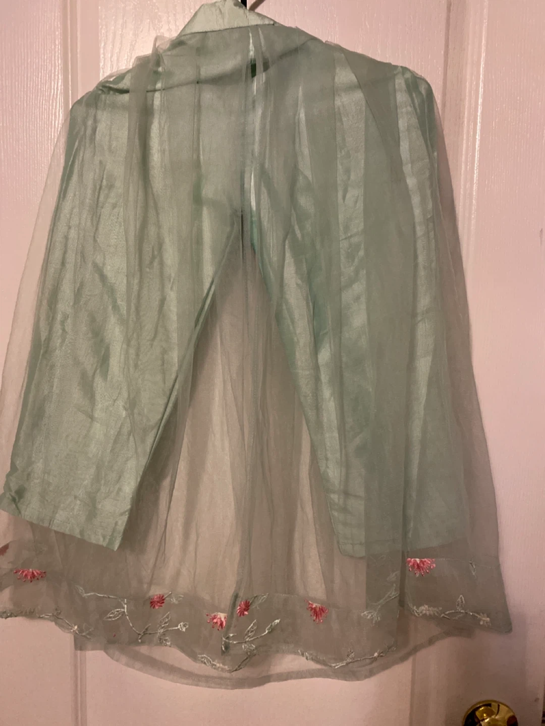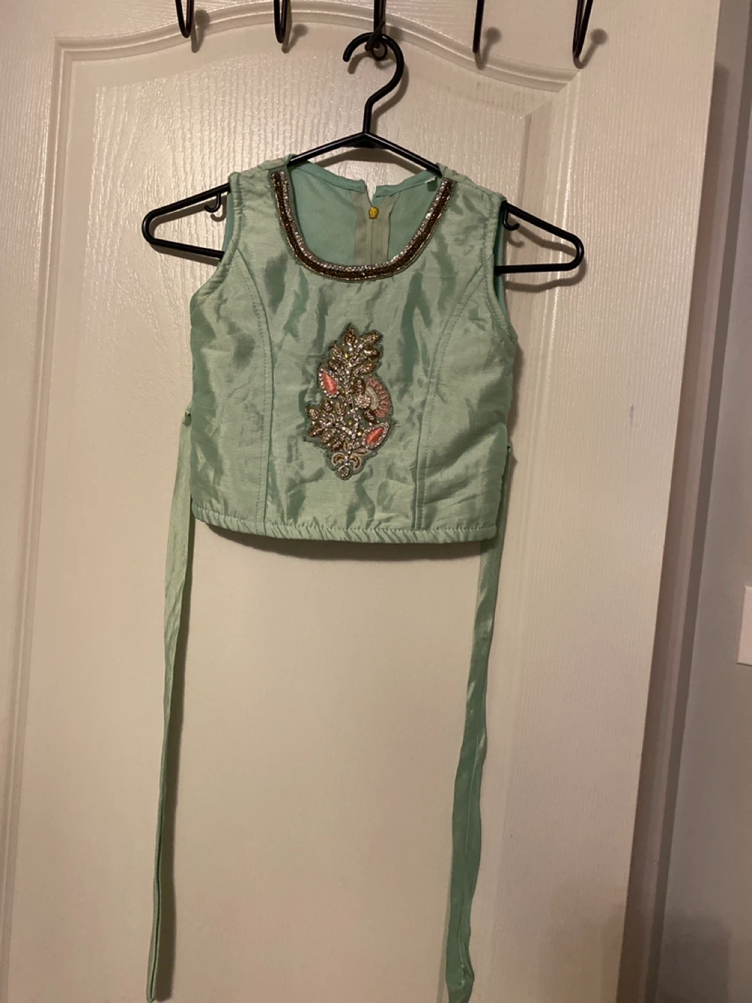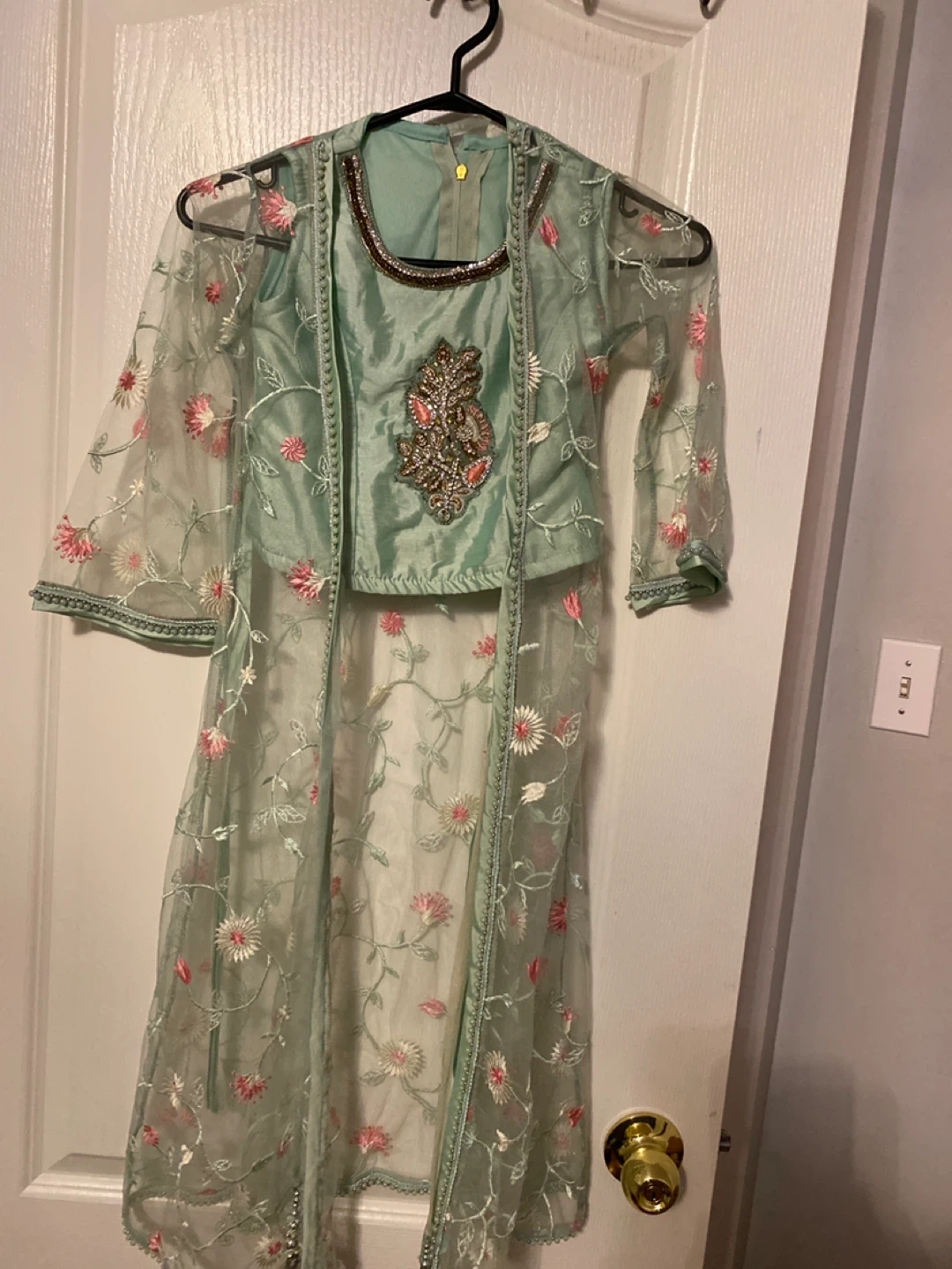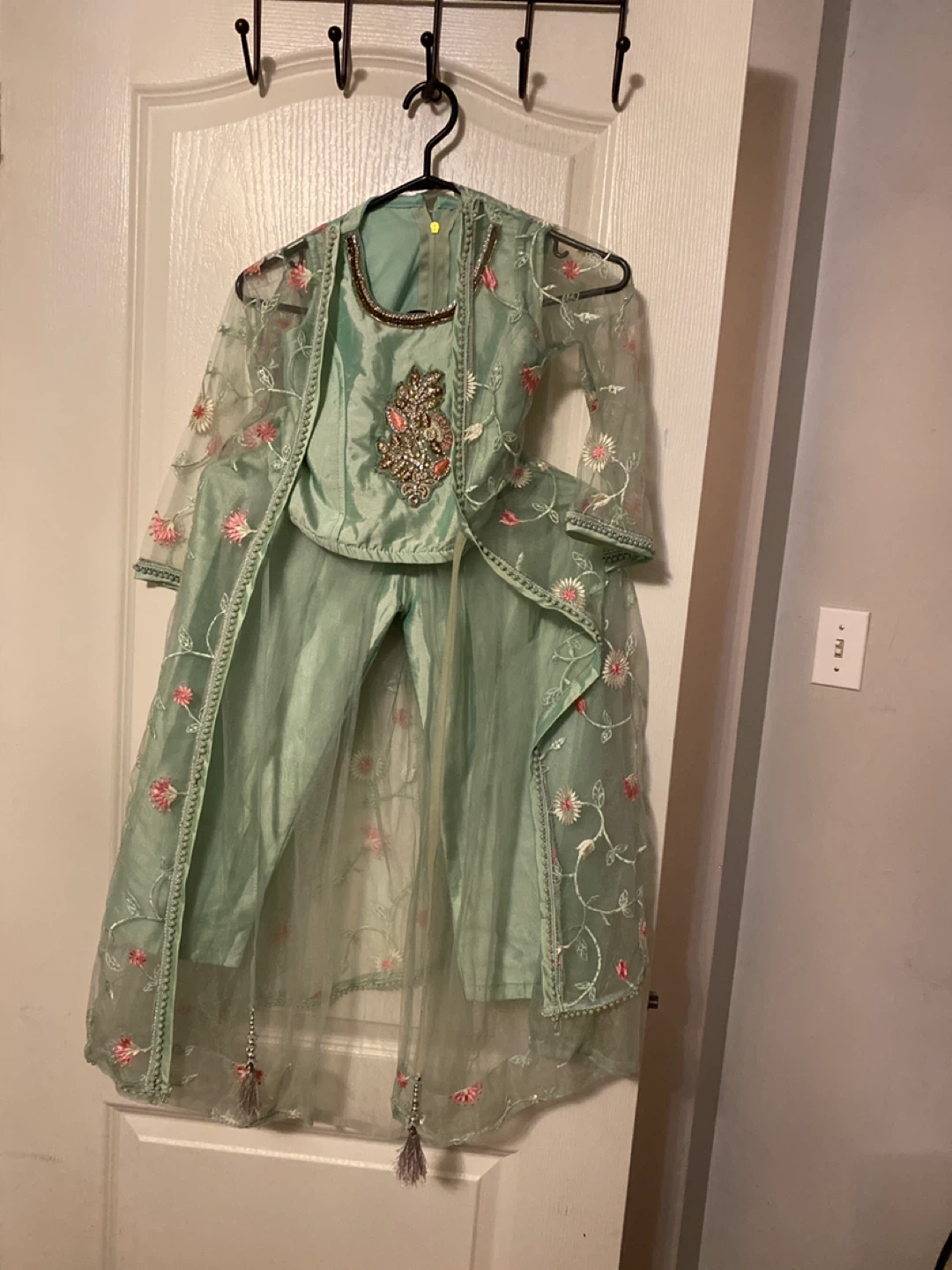 Selling a beautiful girl's Indian outfit. It's a lovely light green colour and includes a top, pants, and a sheer embroidered jacket. Perfect for a special occasion!