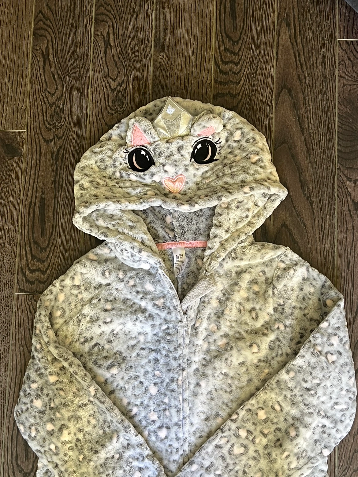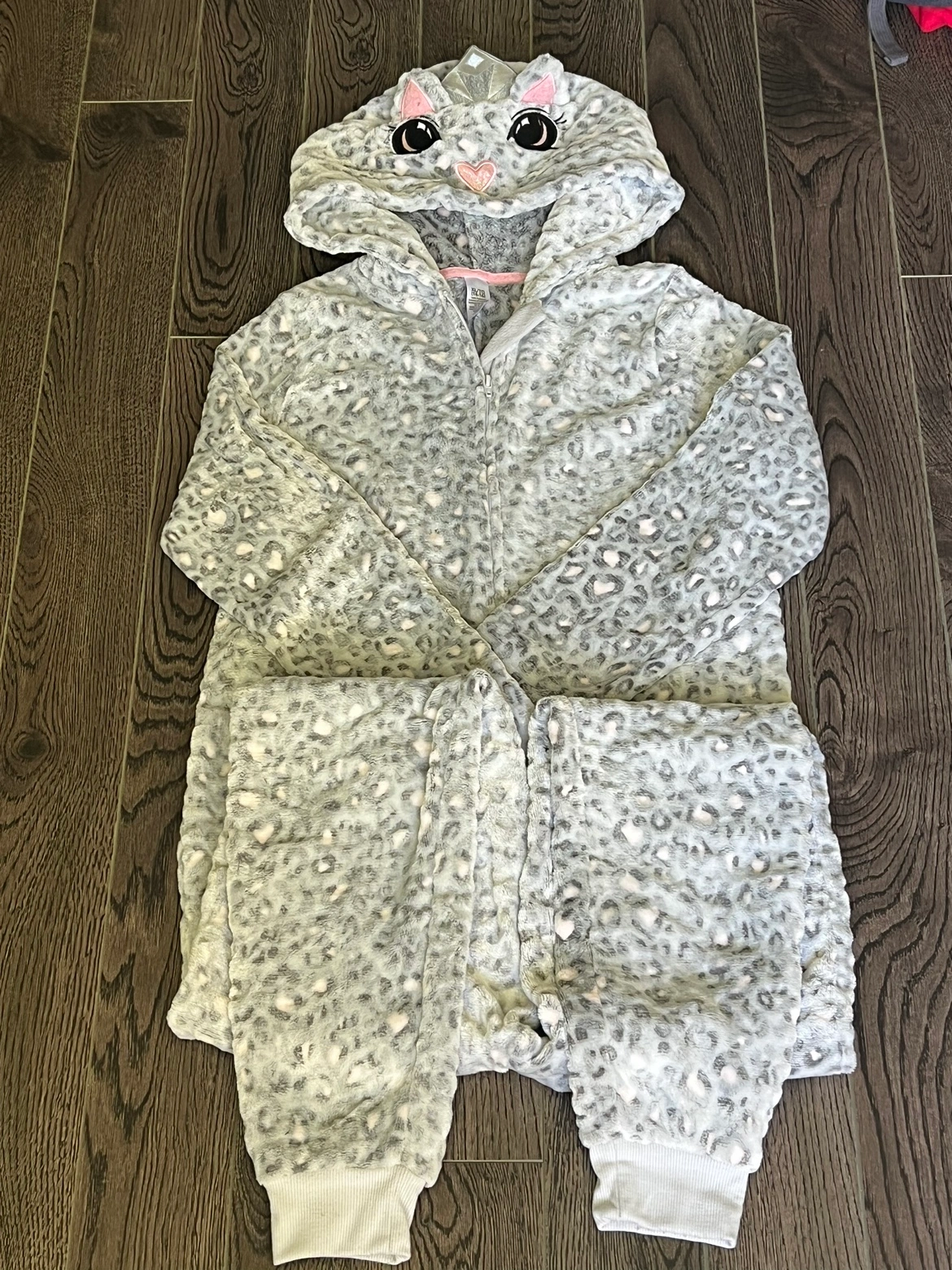 Grey and white leopard print one-piece pajama with a cat face hood. Size XL/TG 14-16. It was worn once or twice so fairly new.