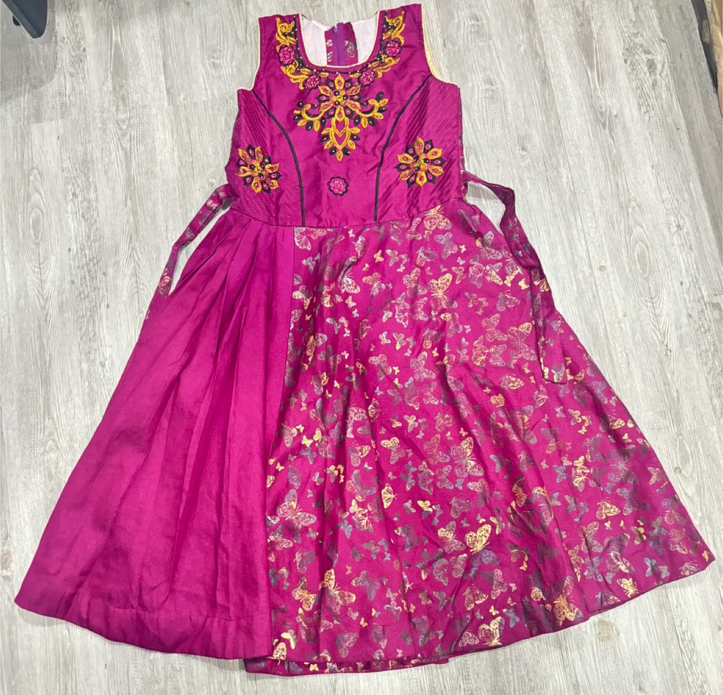 A pretty pink dress for girls! It features a beautiful butterfly print on the skirt and lovely embroidery on the bodice. Perfect for parties or special occasions. In great condition! Size 40