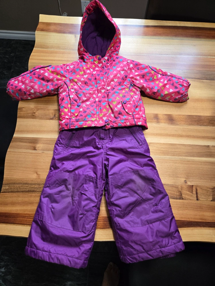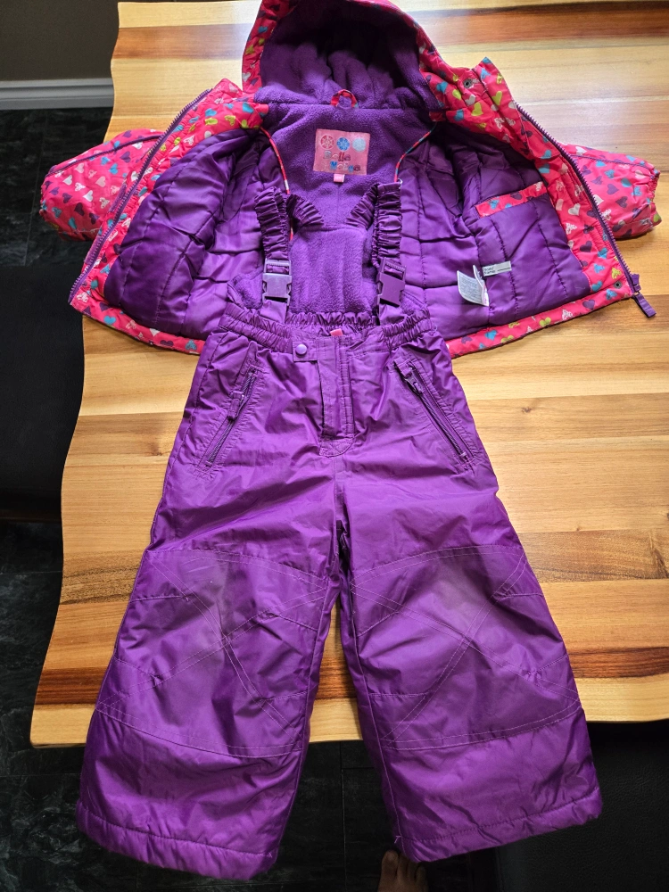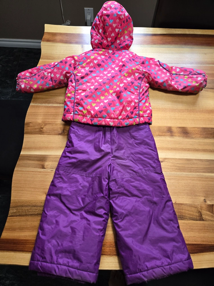 A cute and cozy snowsuit for girls, perfect for winter fun! The jacket features a pink background with a colourful heart pattern. The snow pants are a vibrant purple and have adjustable suspenders for a snug fit. Great for keeping your little one warm and dry on snowy days. Size is: 12 months. Brand is: Belle-Neige.